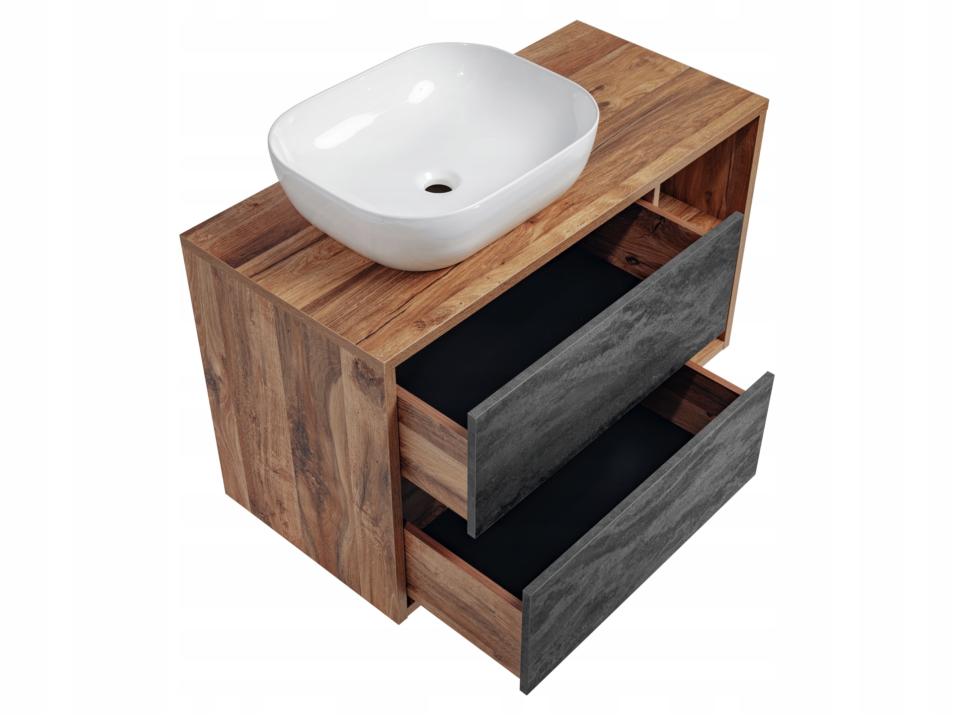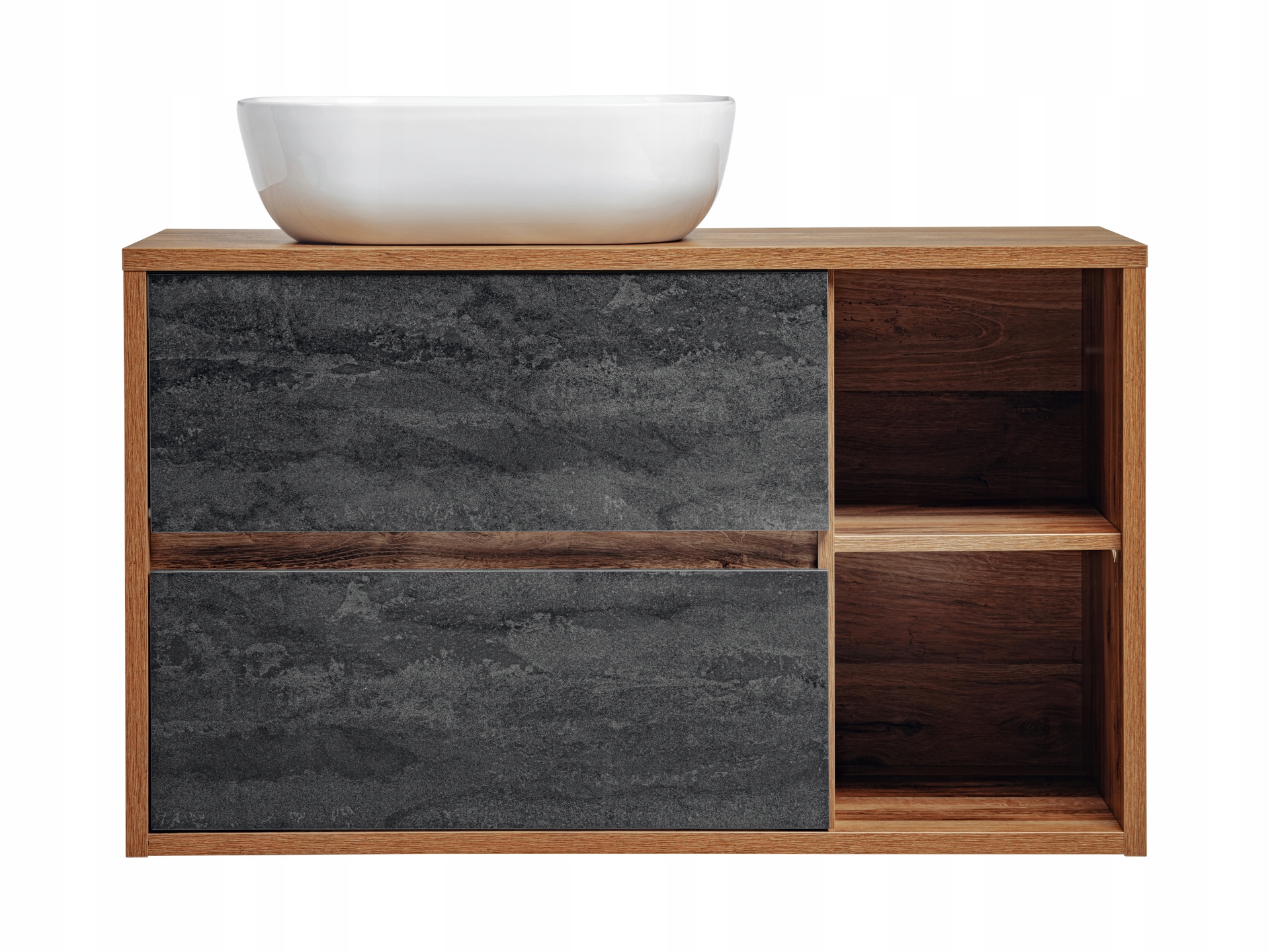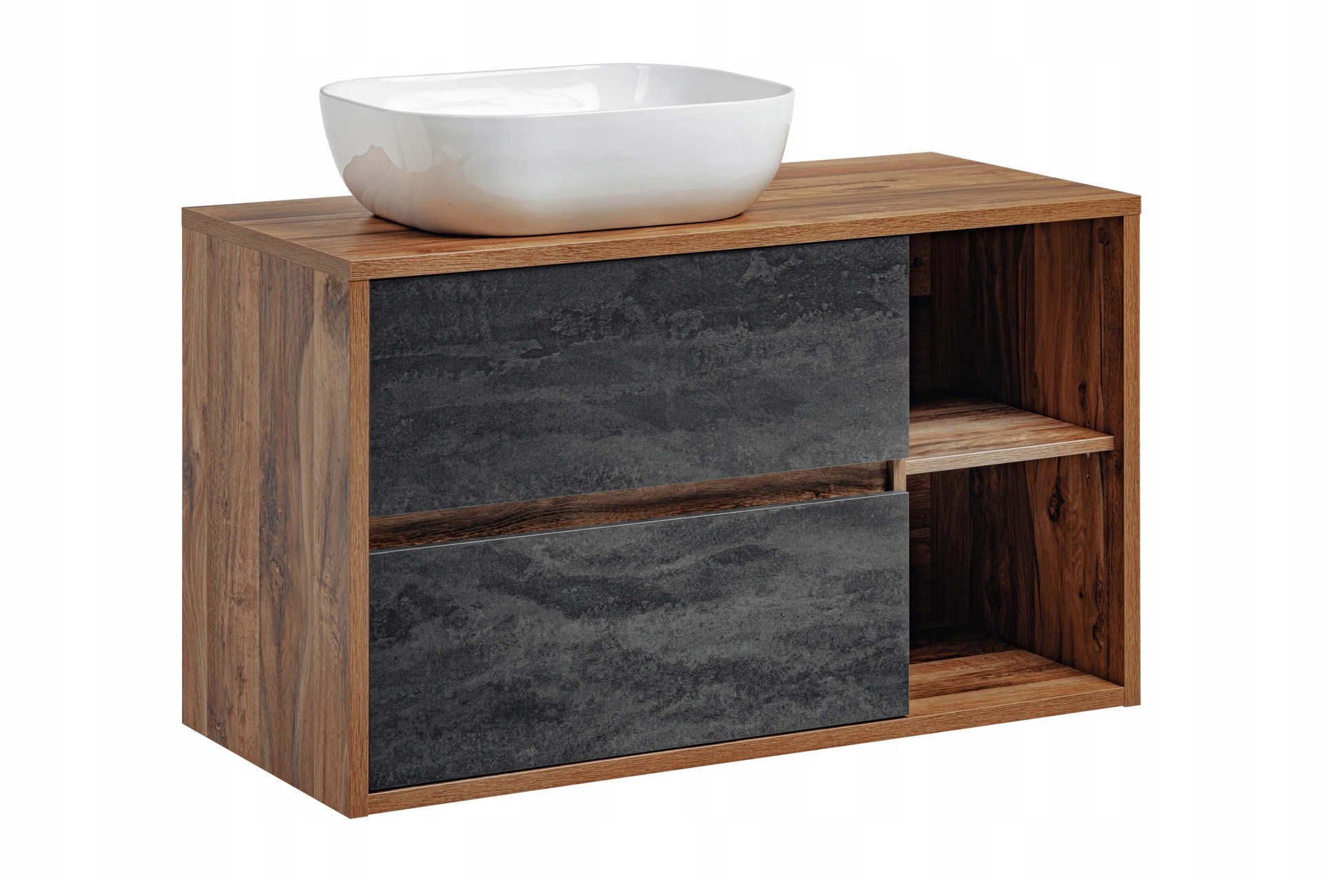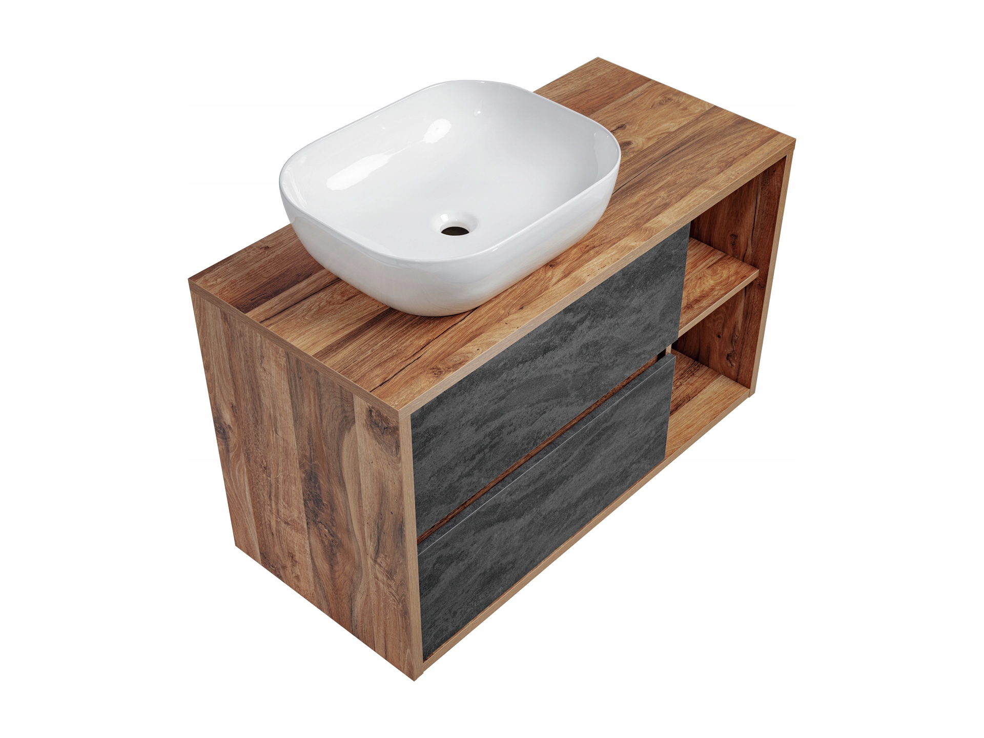 Szafka o szerokości 100 cm jest wyposażona w dwie przestronne szuflady z funkcją cichego domyku, co zapewnia wygodę i komfort codziennego użytkowania. W zestawie znajduje się także umywalka nablatowa w eleganckiej bieli, wykonana z ceramiki najwyższej jakości, która podkreśla unikalny styl mebla.