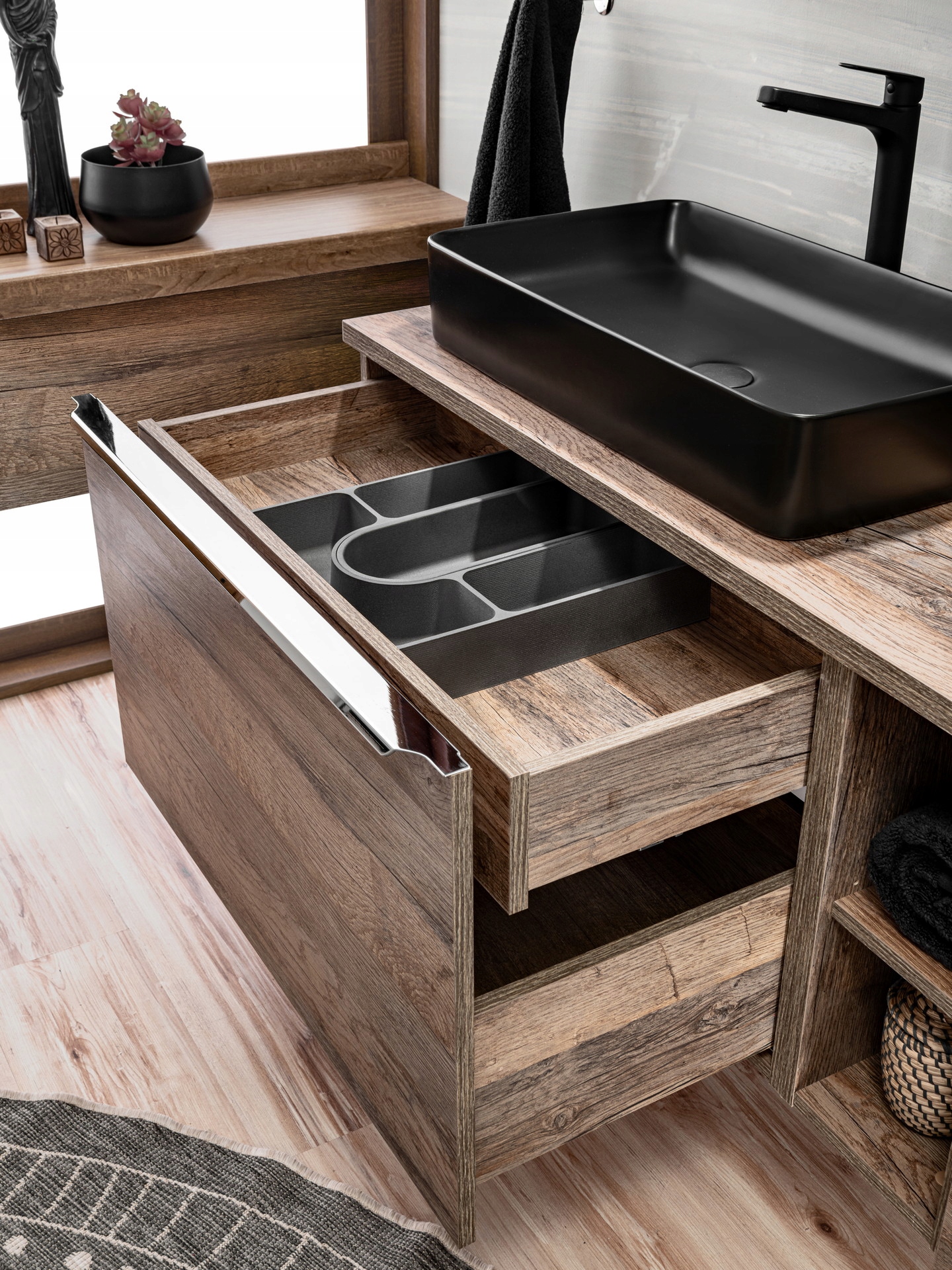 Zestaw SANTA FE OAK w kolorze dębu Vintage to elegancka propozycja dla miłośników nowoczesnych, stylowych wnętrz. Zestaw składa się z dwóch szafek pod umywalkę o łącznej szerokości 160 cm, szerokiego blatu oraz dwóch czarnych, nablatowych umywalek DIANA. Szuflady wyposażone są w dodatkowe wewnętrzne przegródki oraz organizer, co zapewnia doskonałą organizację przestrzeni.