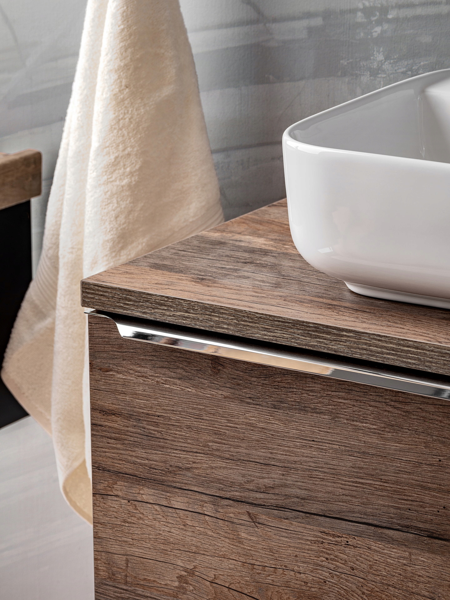 Złote uchwyty dodają zestawowi luksusowego wyrazu, a funkcja cichego domyku gwarantuje komfort użytkowania. SANTA FE OAK to doskonały wybór do przestronnych, stylowych łazienek, gdzie każdy detal ma znaczenie.