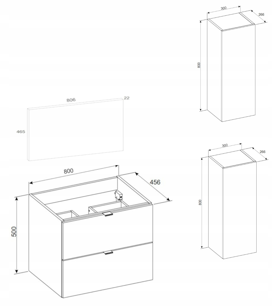 Prawdziwym atutem zestawu jest wiszący słupek, składający się z dwóch półsłupków, z których każdy posiada dwie wewnętrzne półki, co łącznie daje aż sześć przestrzeni do przechowywania. To praktyczne rozwiązanie, które pozwala na wygodne uporządkowanie ręczników, kosmetyków i wszystkich niezbędnych akcesoriów. Brak uchwytów oraz system SOFT CLOSE w drzwiach dodatkowo podkreślają nowoczesny i uporządkowany charakter mebli.