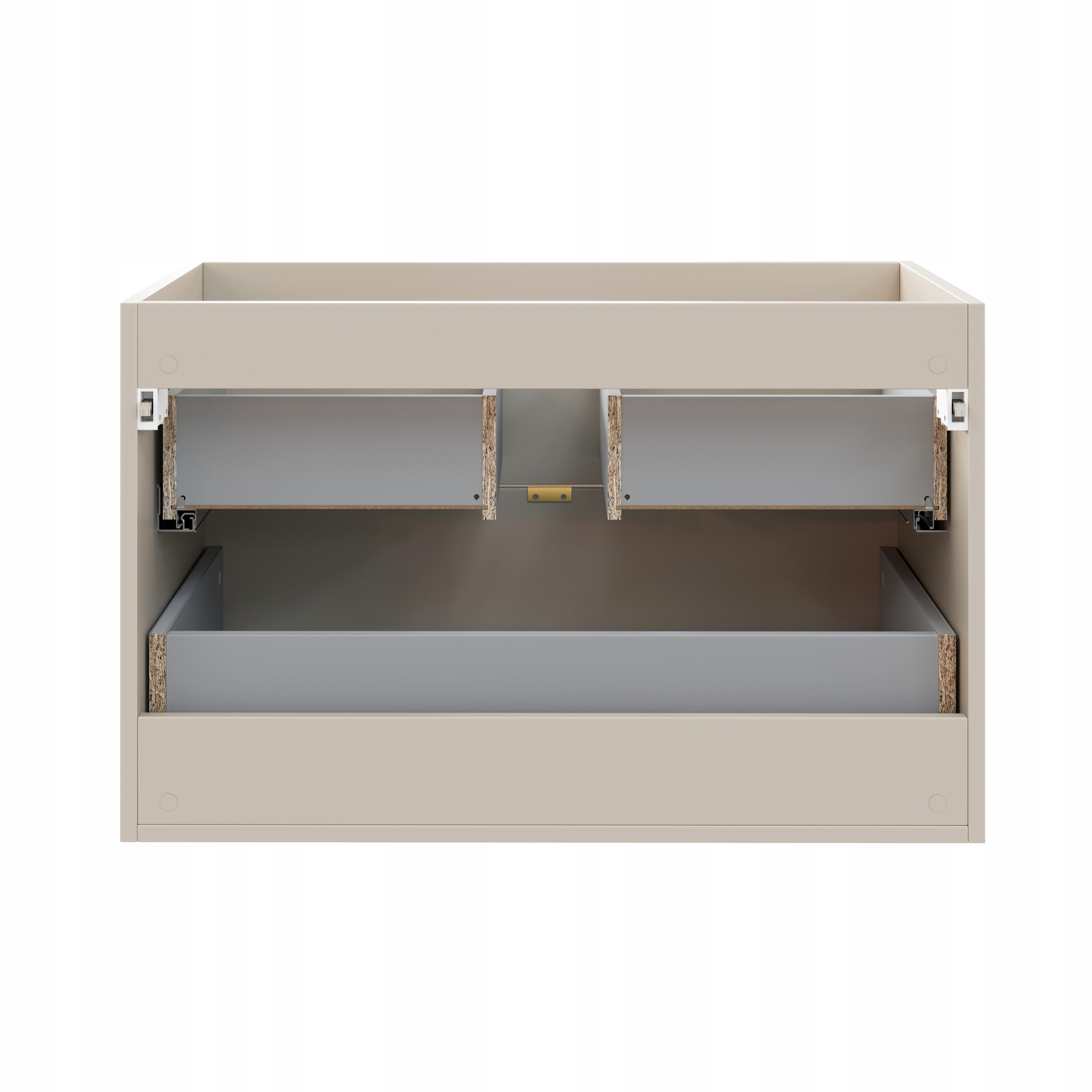 Szafka z gładkimi frontami w kolorze kaszmiru została wyposażona w dwie pojemne szuflady z systemem cichego i płynnego domykania (SOFT CLOSE), gwarantując wygodę codziennego użytkowania. Blat w dekorze dąb wotan dodaje całości naturalnego akcentu, idealnie kontrastując z matowym wykończeniem frontów.