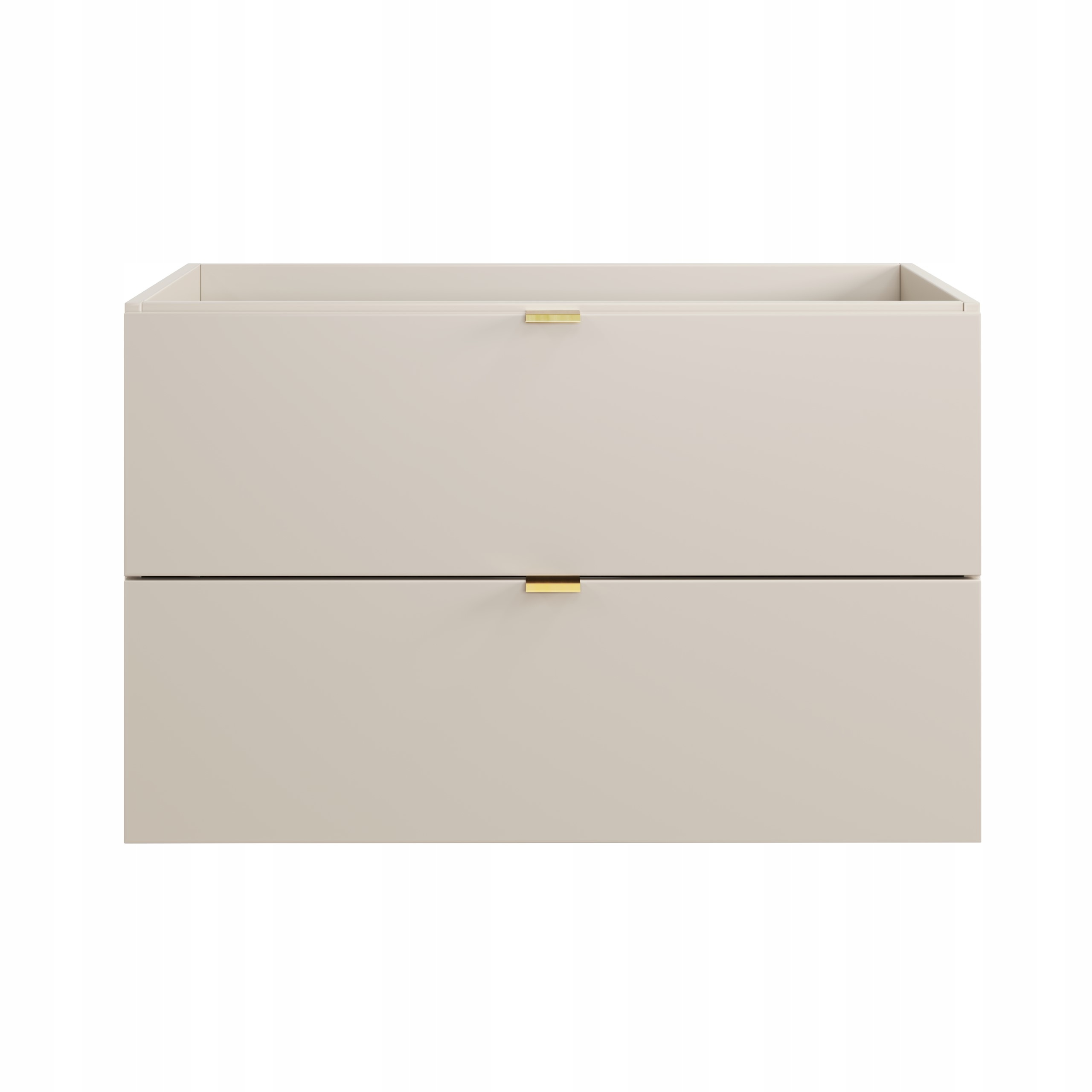 Gładkie fronty w kolorze kaszmiru nadają meblom subtelnej elegancji i minimalistycznego charakteru, idealnie wpisując się w nowoczesne wnętrza. Każda z szafek wyposażona jest w dwie pojemne szuflady z funkcją cichego i płynnego domykania (SOFT CLOSE), co zapewnia wygodę użytkowania i trwałość.