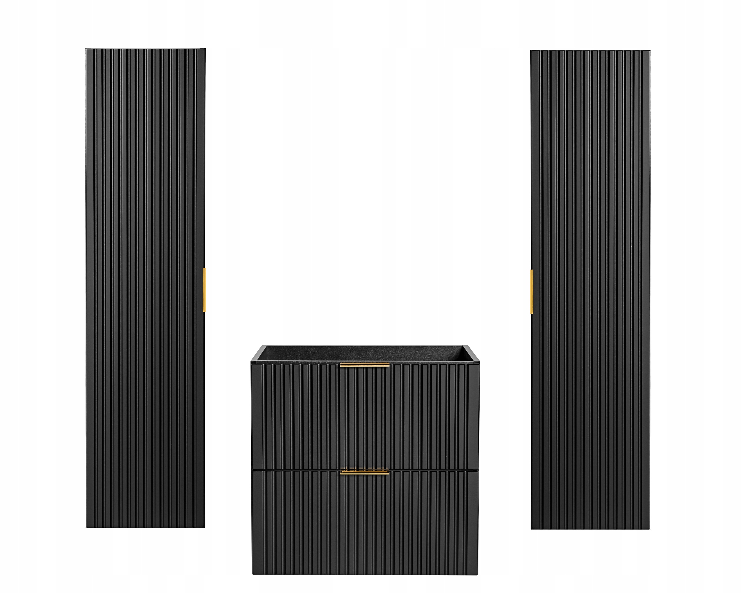 Szafka ADEL BLACK 60 cm wyróżnia się ryflowanym frontem, który nadaje meblowi modny i dekoracyjny charakter. Czarna kolorystyka podkreśla minimalistyczny, loftowy i elegancki styl zestawu. Model posiada dwie pojemne szuflady z systemem cichego domyku, dzięki czemu zapewnia wygodne miejsce na kosmetyki, ręczniki i akcesoria łazienkowe. Górna szuflada jest przygotowana pod syfon — posiada specjalne wycięcie na tylnej ściance, co ułatwia montaż umywalki.