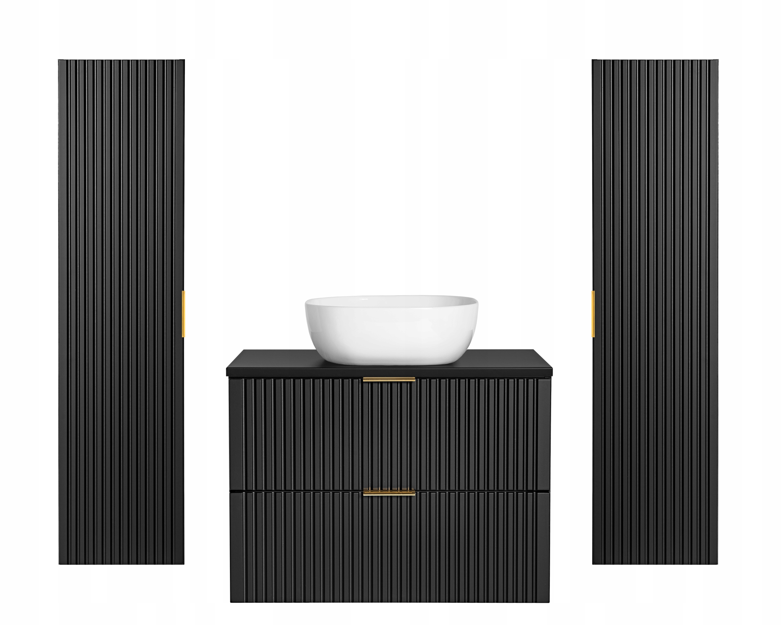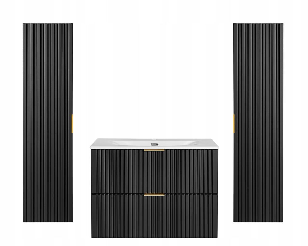 Zestaw mebli łazienkowych ADEL BLACK to propozycja, która łączy elegancję, funkcjonalność i nowoczesny design. Czarny, matowy kolor zestawu nadaje wnętrzu wyrafinowany charakter, doskonale wpisując się zarówno w nowoczesne, jak i klasyczne aranżacje. Frezowane fronty oraz wiszące elementy mebli tworzą lekką i stylową przestrzeń, idealną dla tych, którzy cenią sobie estetykę i praktyczność w swojej łazience.