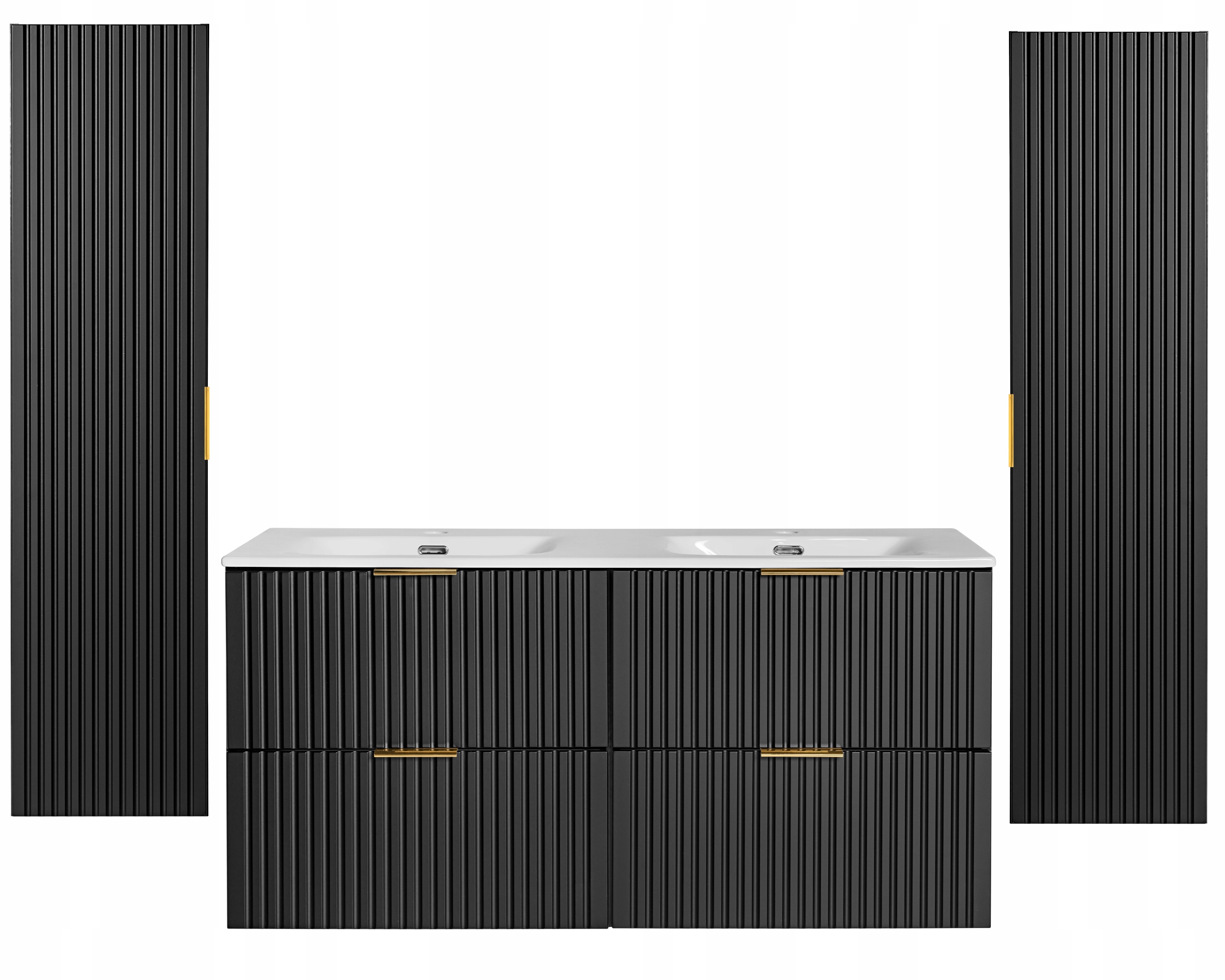 Zestaw mebli łazienkowych ADEL BLACK to propozycja, która łączy elegancję, funkcjonalność i nowoczesny design. Czarny, matowy kolor zestawu nadaje wnętrzu wyrafinowany charakter, doskonale wpisując się zarówno w nowoczesne, jak i klasyczne aranżacje. Frezowane fronty oraz wiszące elementy mebli tworzą lekką i stylową przestrzeń, idealną dla tych, którzy cenią sobie estetykę i praktyczność w swojej łazience.