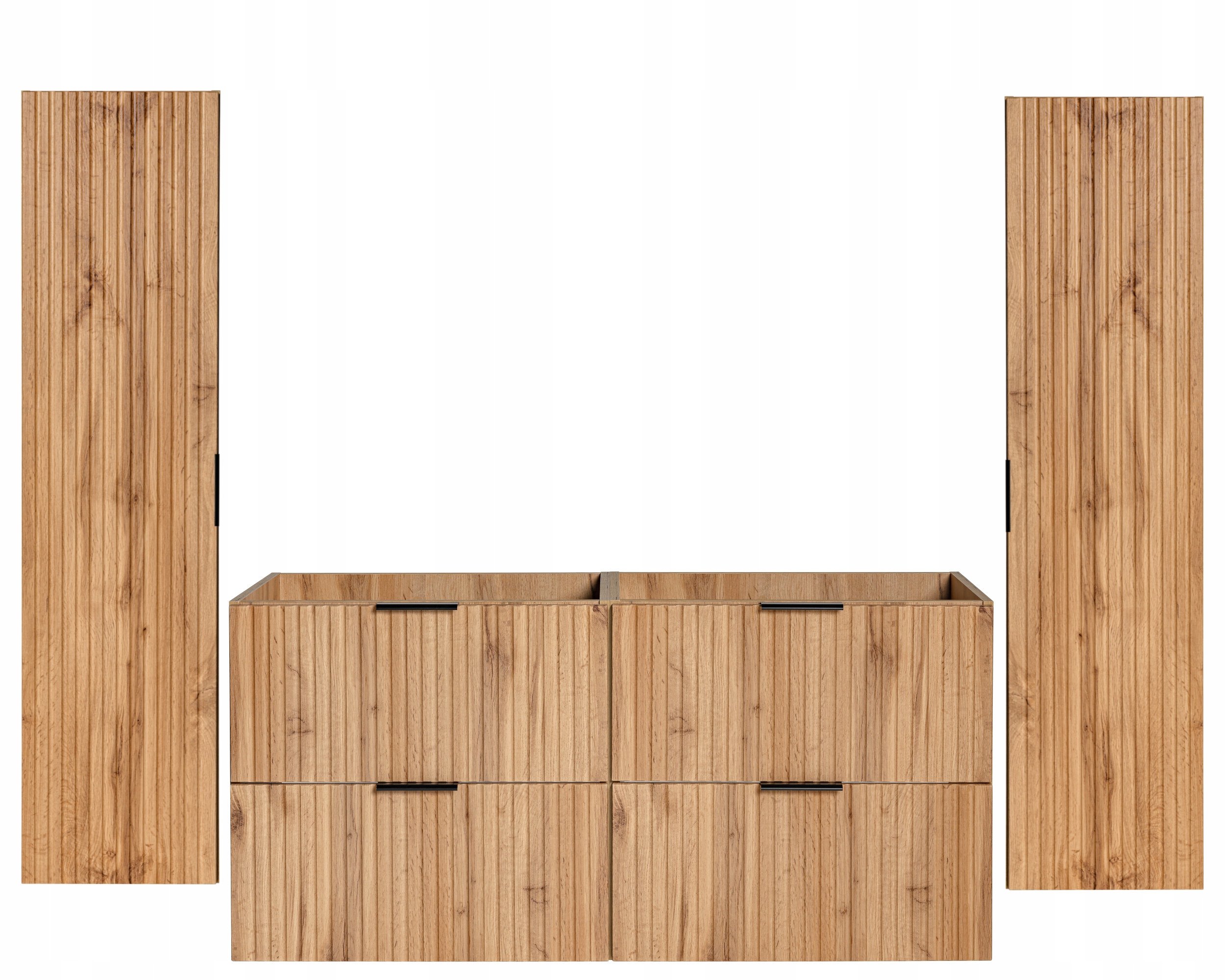 Szafka pod umywalkę wyróżnia się ryflowanymi frontami w kolorze dąb wotan, które nadają całości naturalny, ciepły i dekoracyjny charakter. Dwie szafki 60 cm tworzą szeroką zabudowę 120 cm, idealną pod umywalkę nablatową lub blat łazienkowy. Każda szafka posiada pojemne szuflady z systemem cichego domyku, które ułatwiają przechowywanie kosmetyków, ręczników i akcesoriów łazienkowych. Górne szuflady są przygotowane pod syfon — posiadają specjalne wycięcie na tylnej ściance, co ułatwia montaż umywalki nablatowej.