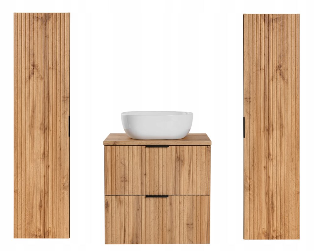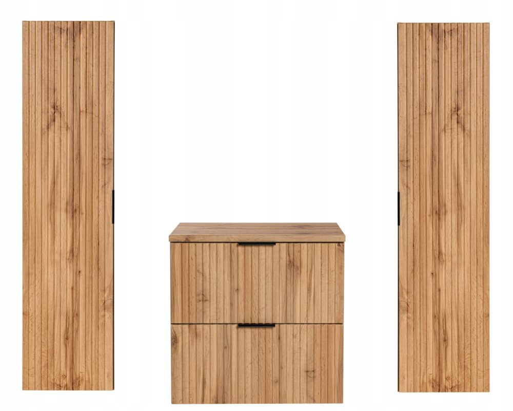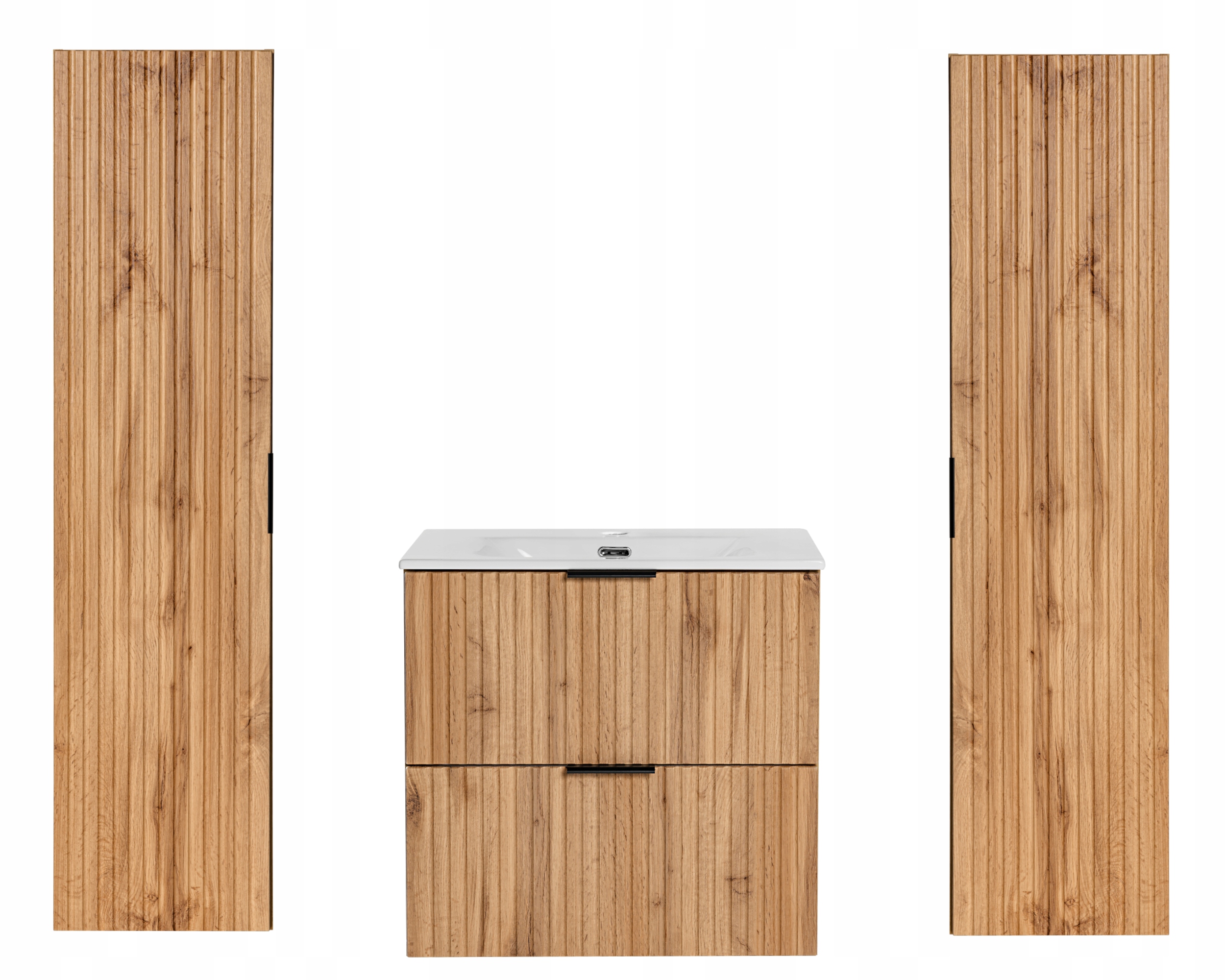 Kolekcja ADEL OAK to elegancki zestaw mebli łazienkowych, który łączy nowoczesny design z funkcjonalnością, doskonale wpisując się w każde wnętrze. Dzięki unikalnym, ryflowanym frontom i możliwości personalizacji uchwytów, stworzysz łazienkę, która idealnie odda Twój styl. W zestawie znajdują się wiszące szafki pod umywalkę oraz słupki, które maksymalizują przestrzeń przechowywania. Dodatkowo, opcje uchwytów w trzech kolorach: czarny, złoty, chrom pozwalają na spersonalizowanie wyglądu, co nada Twojej łazience wyjątkowego charakteru. Ciesz się komfortem dzięki funkcji SOFT CLOSE, która zapewnia ciche domykanie drzwi i szuflad. Meble wiszące to nie tylko nowoczesny styl, ale także łatwość utrzymania czystości.