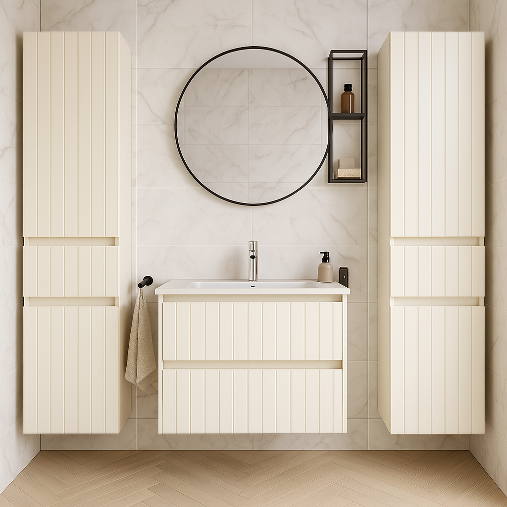 Kolekcja Mebli Łazienkowych Line to idealne połączenie nowoczesnej estetyki i praktycznych rozwiązań. Frezowane fronty, matowe wykończenie w ciepłym migdałowym odcieniu oraz trwałe materiały sprawiają, że meble tej serii doskonale komponują się z różnymi aranżacjami łazienek. Dzięki systemowi cichego domyku oraz gotowym do montażu elementom, kolekcja Line gwarantuje nie tylko stylowy wygląd, ale również codzienną wygodę użytkowania. Prezentowany zestaw to pojemna szafka 80 cm, ceramiczna umywalka oraz dwa słupki – idealne rozwiązanie dla osób szukających eleganckiego i funkcjonalnego wyposażenia łazienki.
