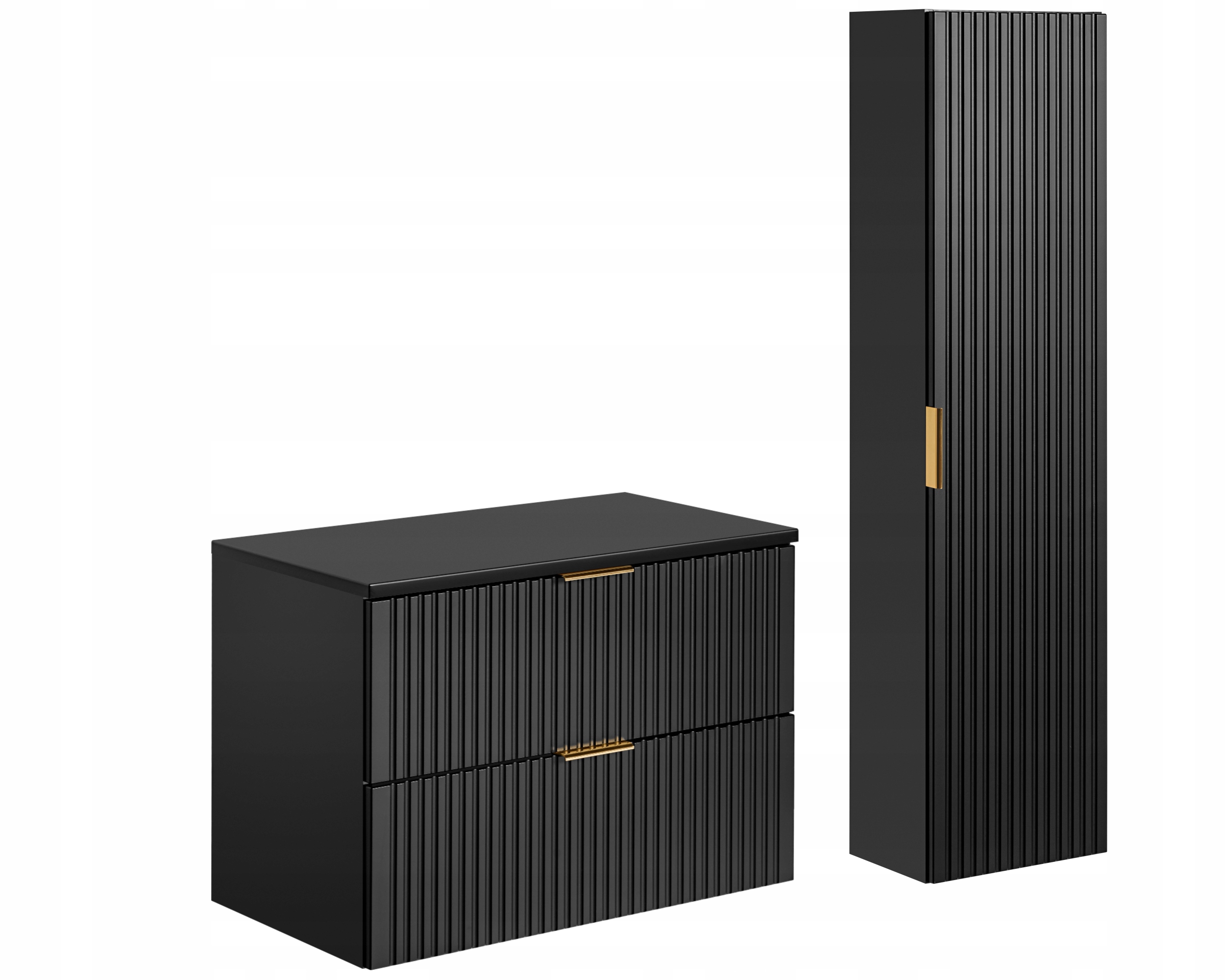 Szafka ADEL BLACK 80 cm wyróżnia się ryflowanym frontem, który nadaje meblowi modny i dekoracyjny charakter. Czarna kolorystyka podkreśla minimalistyczny, loftowy i elegancki styl zestawu. Model posiada dwie pojemne szuflady z systemem cichego domyku, dzięki czemu zapewnia wygodne miejsce na kosmetyki, ręczniki i akcesoria łazienkowe. Górna szuflada jest przygotowana pod syfon — posiada specjalne wycięcie na tylnej ściance, co ułatwia montaż umywalki nablatowej.