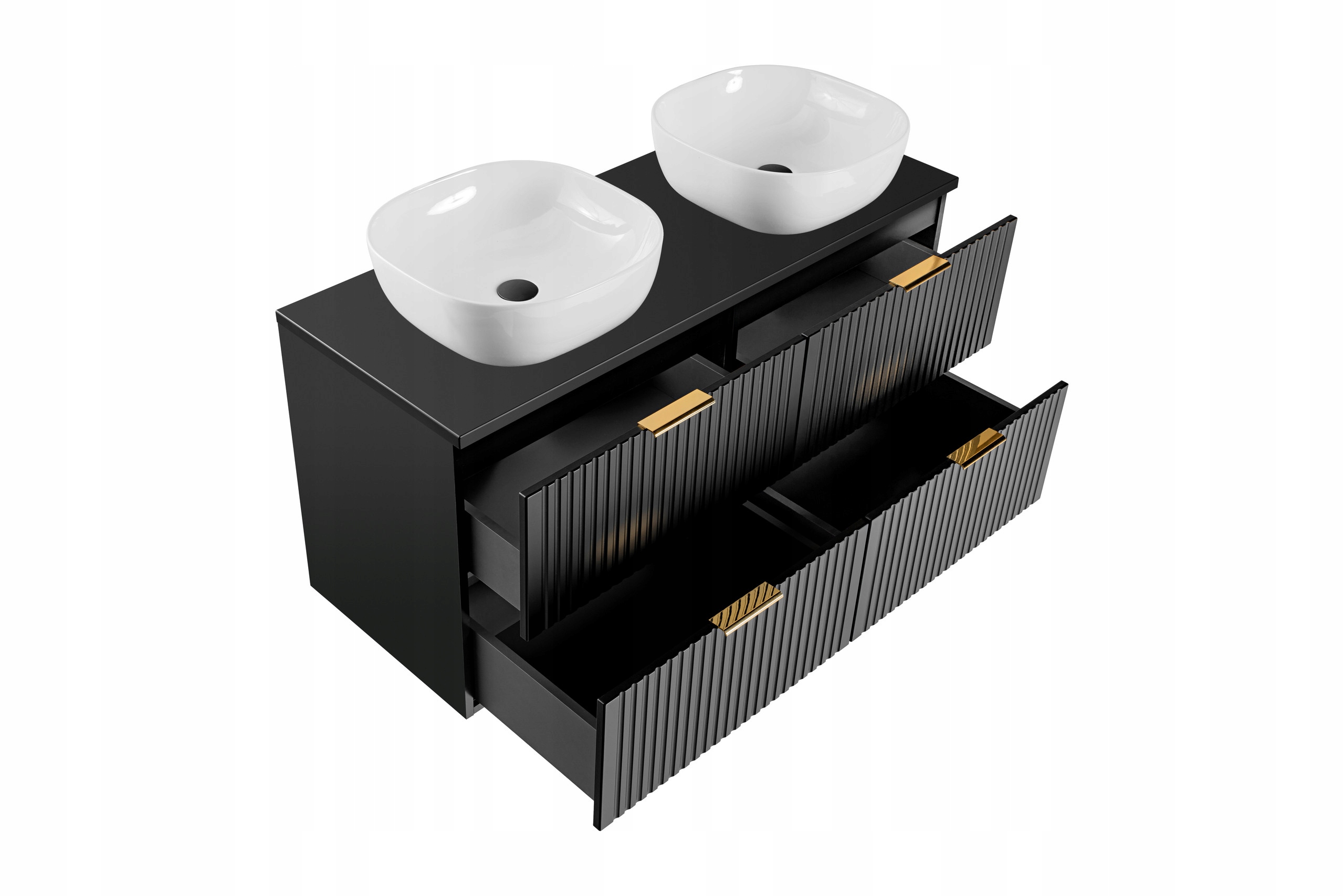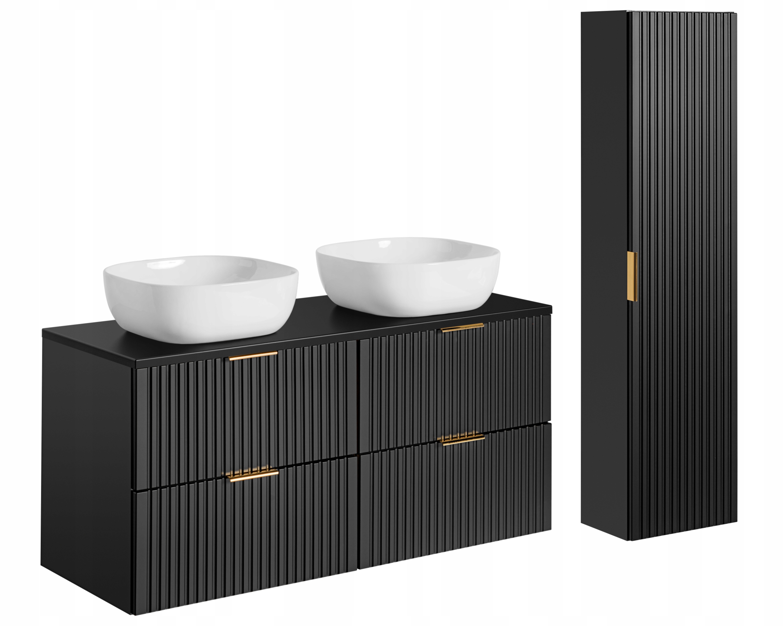 Zestaw mebli łazienkowych ADEL BLACK to propozycja, która łączy elegancję, funkcjonalność i nowoczesny design. Czarny, matowy kolor zestawu nadaje wnętrzu wyrafinowany charakter, doskonale wpisując się zarówno w nowoczesne, jak i klasyczne aranżacje. Frezowane fronty oraz wiszące elementy mebli tworzą lekką i stylową przestrzeń, idealną dla tych, którzy cenią sobie estetykę i praktyczność w swojej łazience.