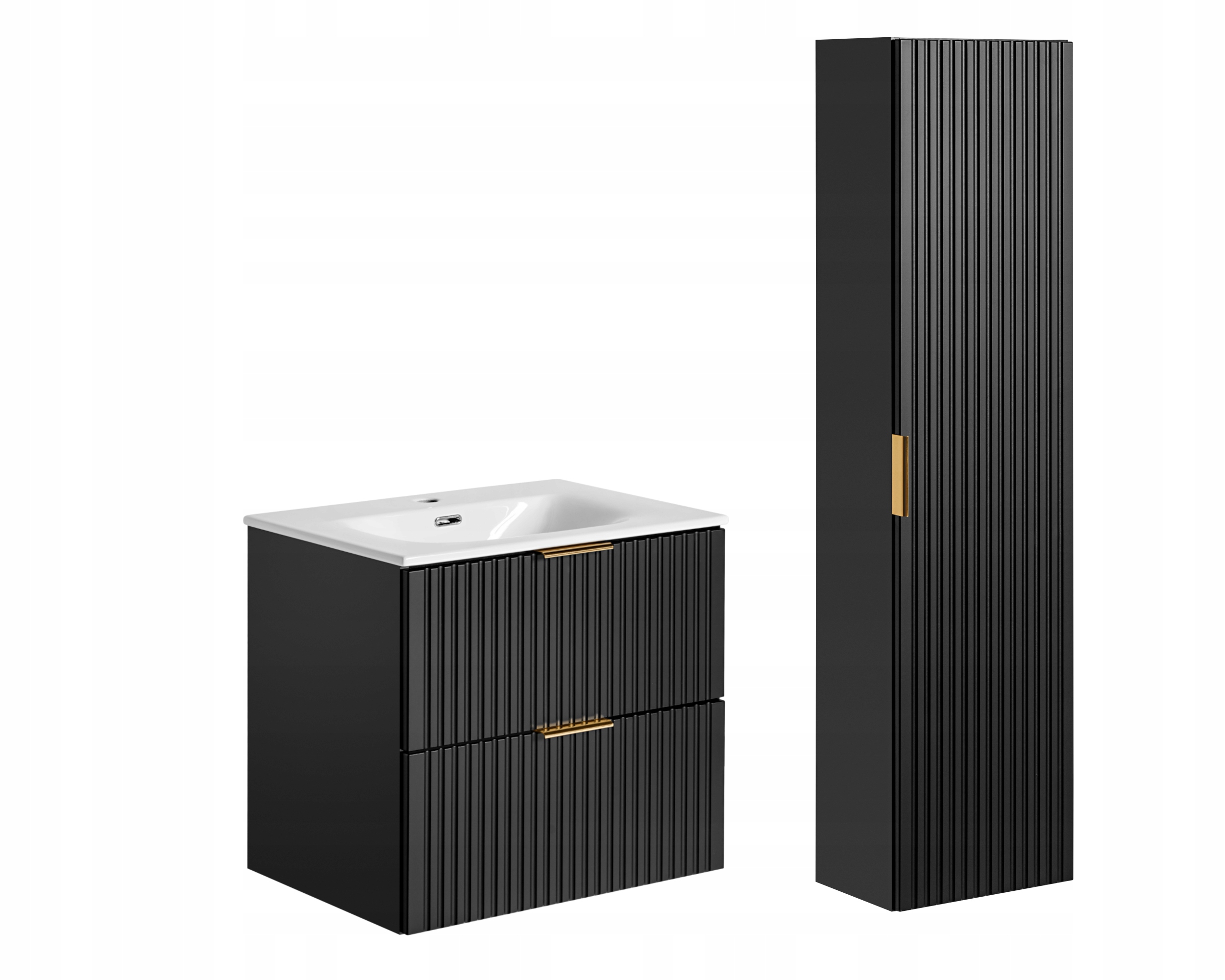 Zestaw mebli łazienkowych ADEL BLACK to propozycja, która łączy elegancję, funkcjonalność i nowoczesny design. Czarny, matowy kolor zestawu nadaje wnętrzu wyrafinowany charakter, doskonale wpisując się zarówno w nowoczesne, jak i klasyczne aranżacje. Frezowane fronty oraz wiszące elementy mebli tworzą lekką i stylową przestrzeń, idealną dla tych, którzy cenią sobie estetykę i praktyczność w swojej łazience.