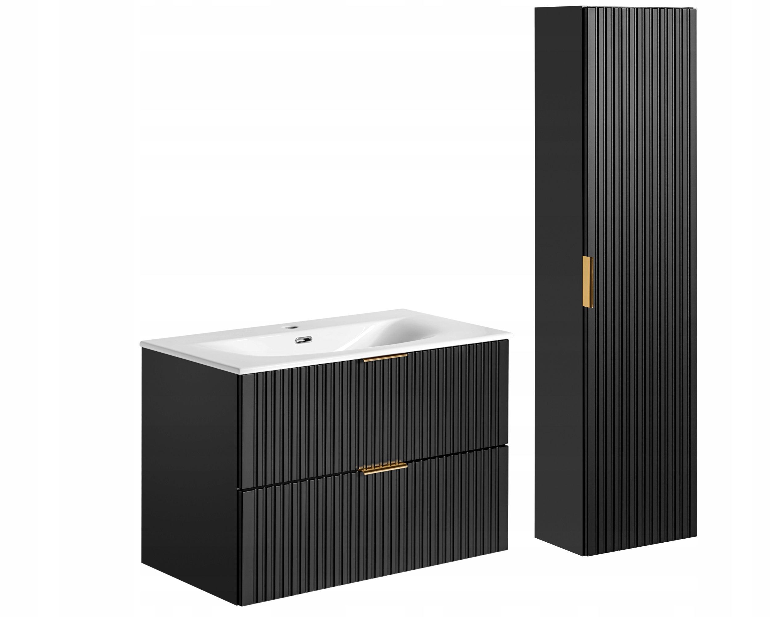 Szafka pod umywalkę oferuje przestrzeń do przechowywania, natomiast wysoki słupek łazienkowy zapewnia dodatkowe miejsce na kosmetyki i akcesoria. Całość uzupełnia dopasowana umywalka, tworząc spójną i nowoczesną strefę umywalkową.