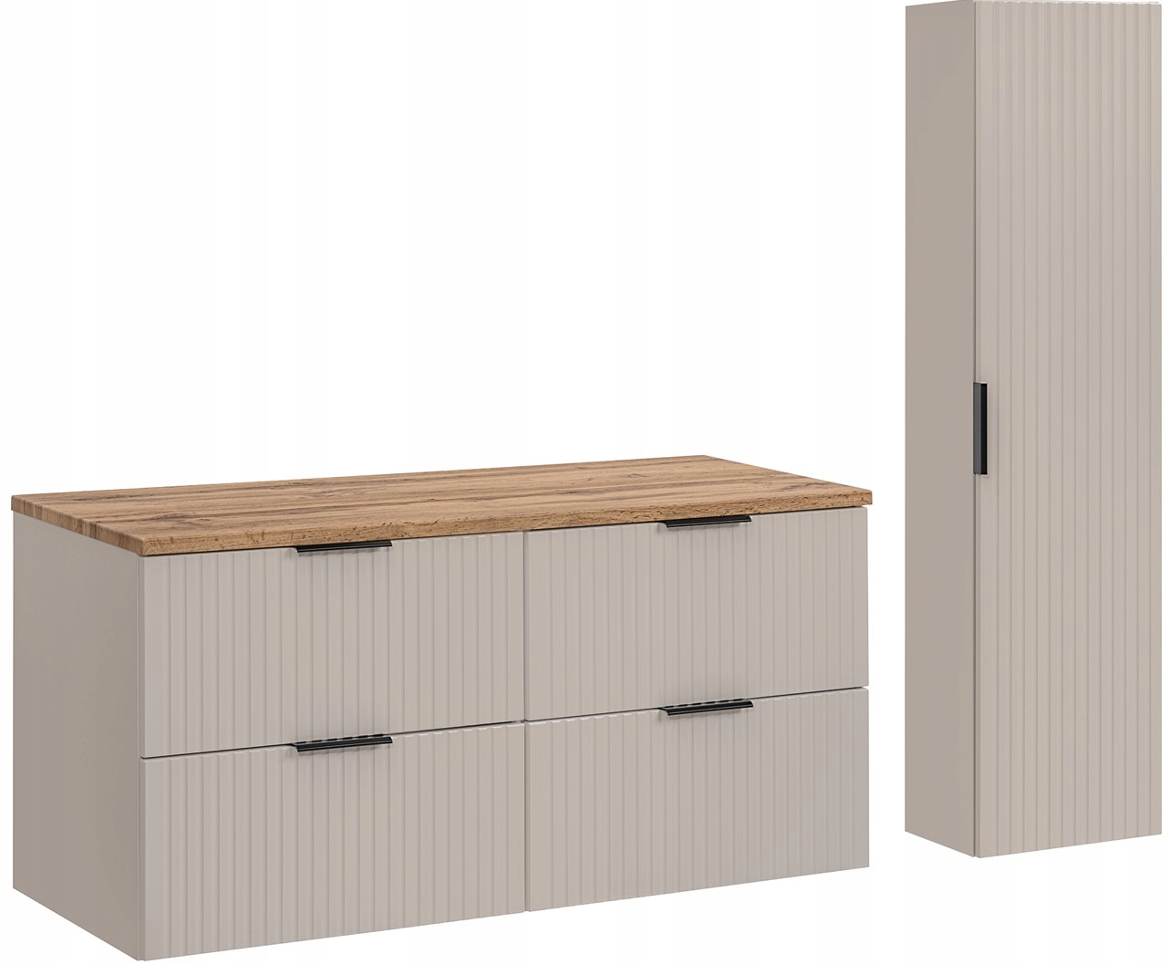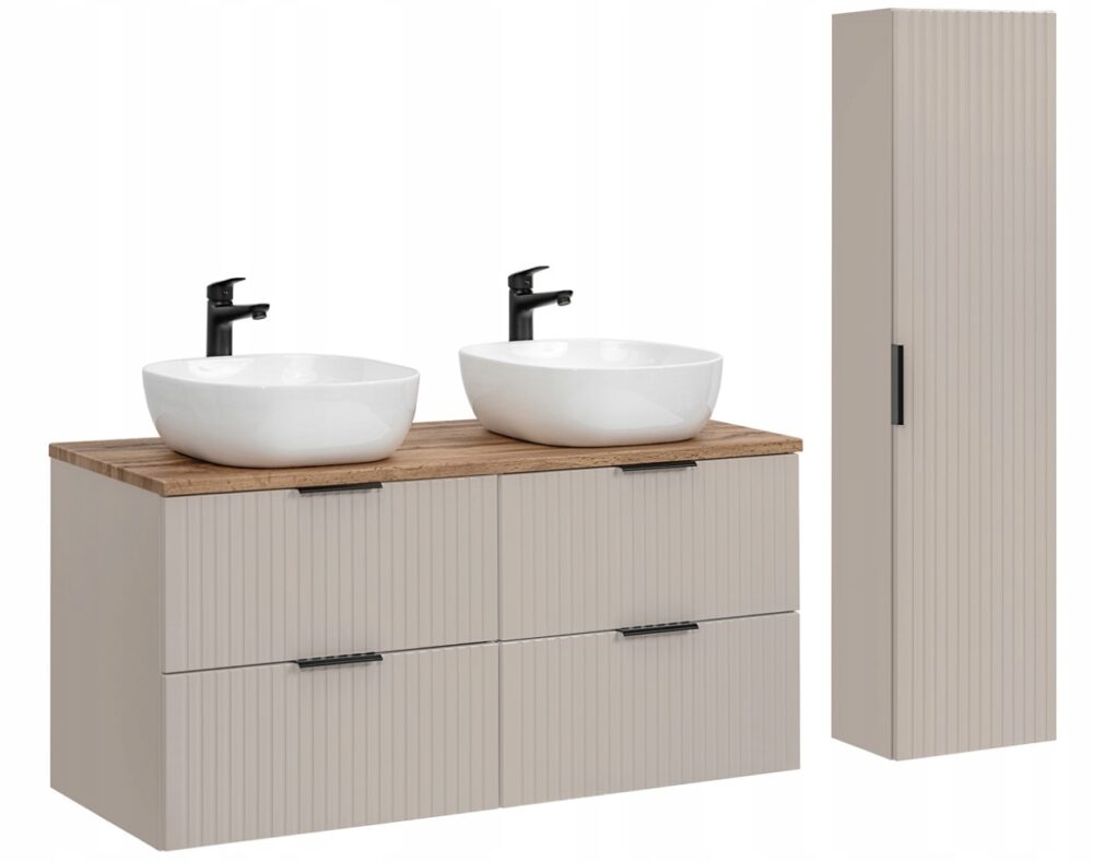Zestaw łazienkowy z kolekcji ADEL w kaszmirowym odcieniu to elegancja i funkcjonalność w jednym. W jego skład wchodzą dwie wiszące szafki pod umywalkę o szerokości 60 cm każda, wysoki słupek oraz blat w kolorze Dąb Wotan, który dodaje ciepła i naturalnego akcentu do aranżacji łazienki. Ryflowane fronty i subtelny kolor kaszmiru nadają meblom nowoczesnego, a zarazem ponadczasowego wyglądu.