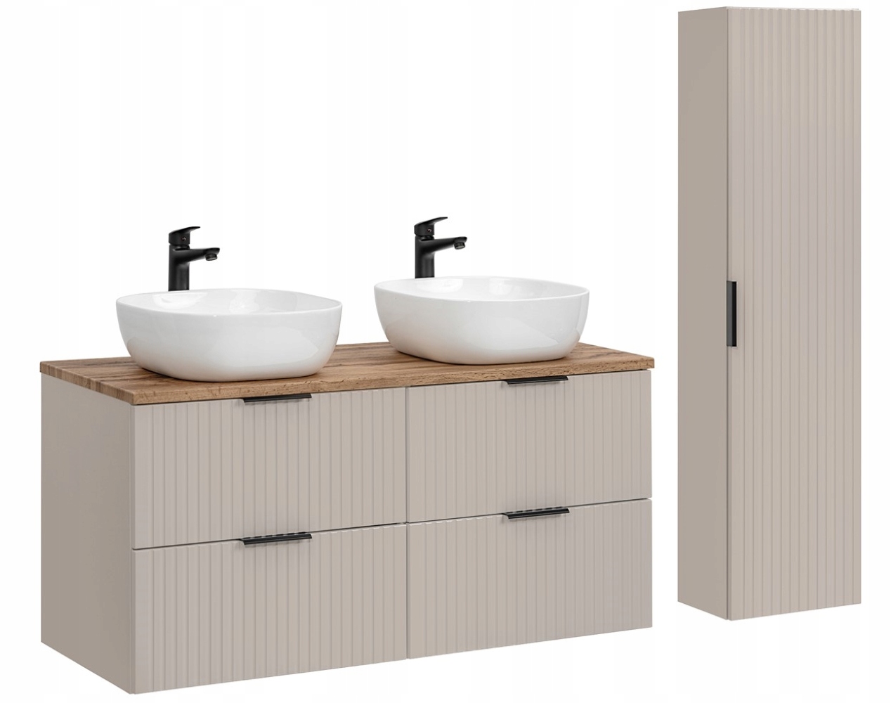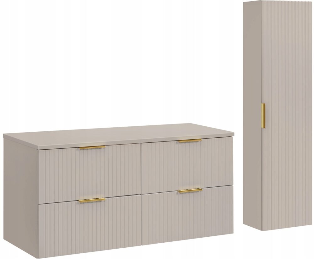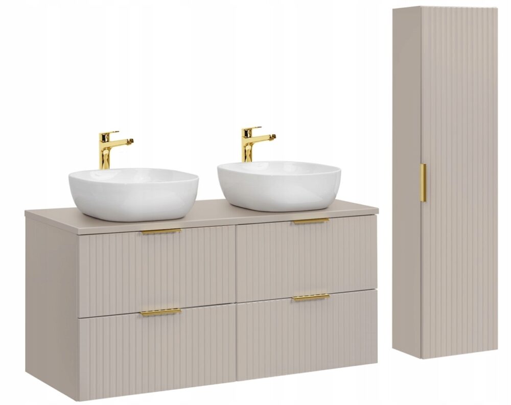 Zestaw łazienkowy ADEL w kaszmirowym wykończeniu to stylowa propozycja do nowoczesnych i klasycznych łazienek. Zawiera szafkę wiszącą z dwoma umywalkami, słupek oraz elegancki blat w kolorze dąb wotan. Ryflowane fronty wprowadzają oryginalny charakter, a możliwość wyboru koloru uchwytów (złoty połysk, chrom, czarny mat) pozwala na dostosowanie zestawu do pozostałych elementów wnętrza.