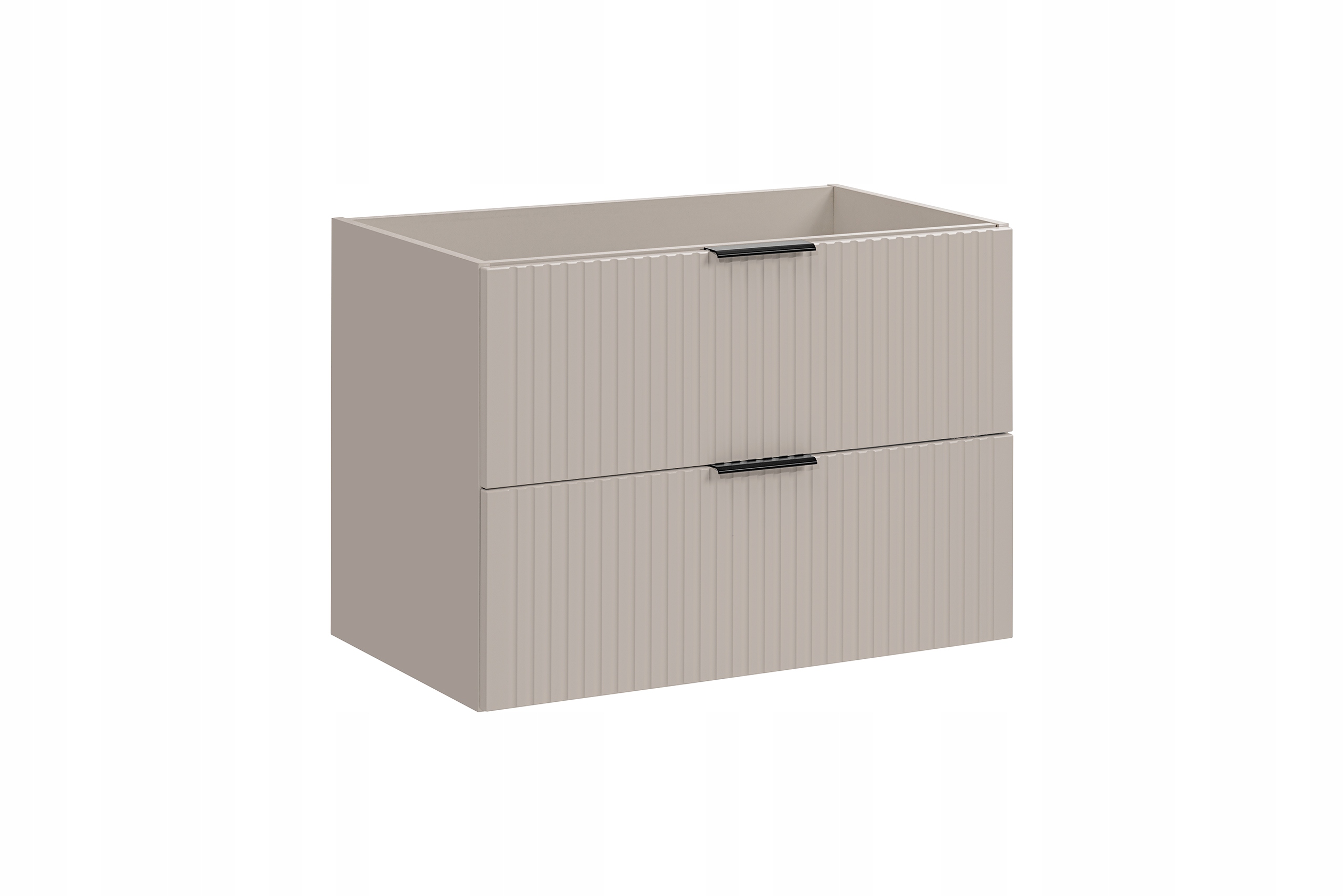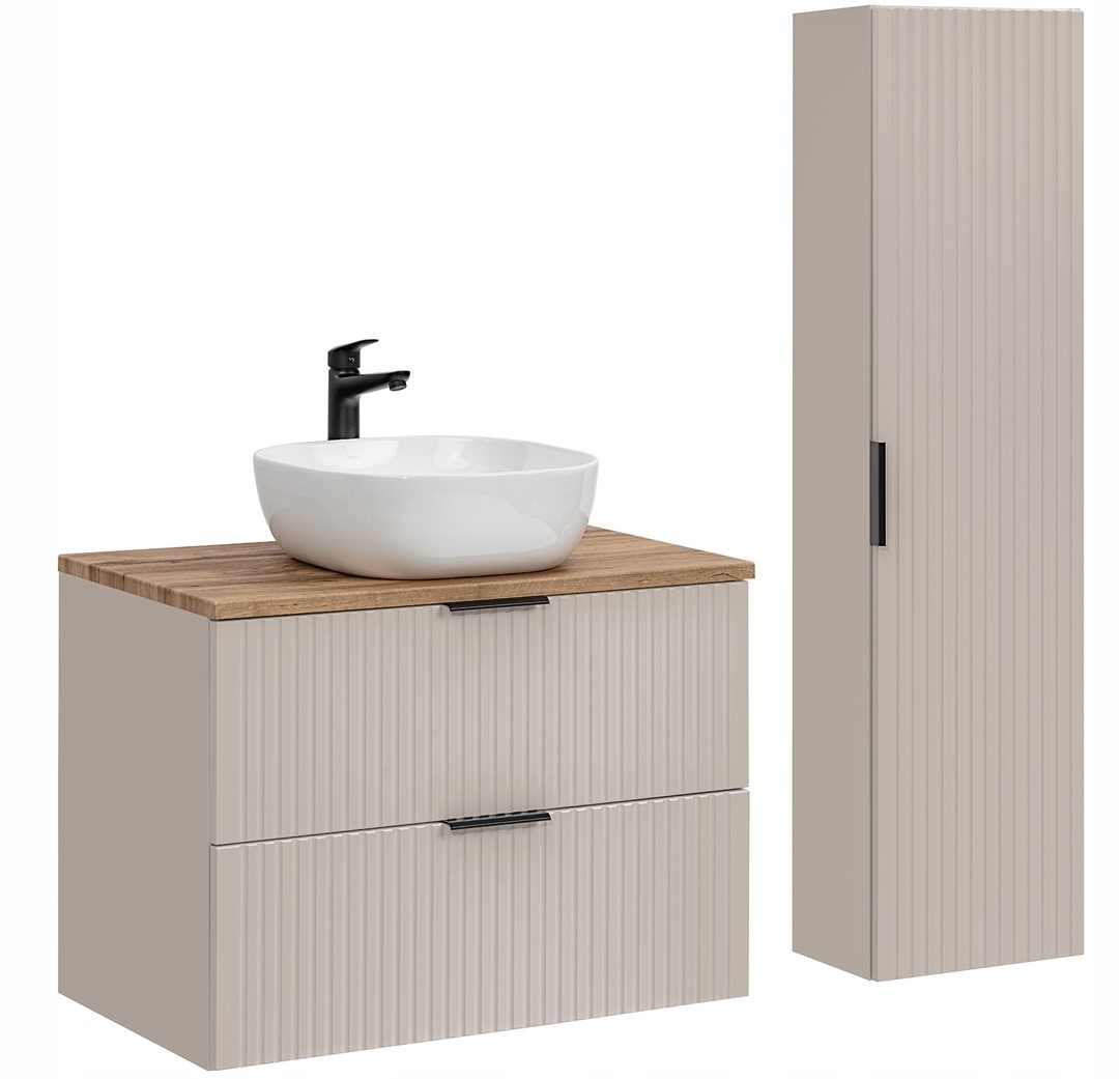 Zestaw łazienkowy ADEL w kaszmirowym wykończeniu z ryflowanymi frontami to stylowe i funkcjonalne rozwiązanie do nowoczesnych łazienek. Zawiera szafkę wiszącą z umywalką, słupek oraz blat w kolorze dąb wotan, tworząc spójny i elegancki komplet. Charakterystyczne frezowane fronty oraz opcja wyboru koloru uchwytów (złoty połysk, chrom, czarny mat) pozwalają na pełne dostosowanie zestawu do wnętrza, dodając łazience wyjątkowego charakteru.