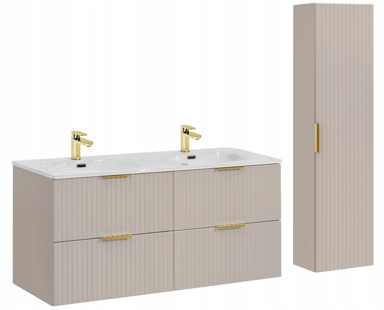 Zestaw łazienkowy ADEL w kaszmirowym wykończeniu z frezowanymi frontami to doskonała propozycja do stylowej łazienki. W skład zestawu wchodzą dwie wiszące szafki pod umywalkę, pojedynczy słupek oraz szeroka umywalka. Subtelne ryflowanie frontów dodaje elegancji, a opcja trzech kolorów uchwytów (złoty połysk, chrom, czarny mat) umożliwia dostosowanie zestawu do różnych aranżacji.