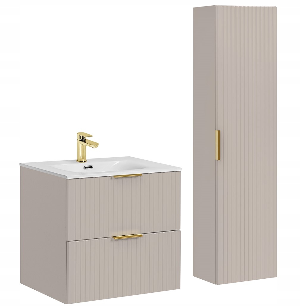 Zestaw łazienkowy ADEL w eleganckim kaszmirowym wykończeniu z ryflowanymi frontami to idealne rozwiązanie dla osób poszukujących nowoczesnego stylu i funkcjonalności. Zestaw zawiera wiszącą szafkę pod umywalkę, słupek oraz stylową umywalkę, co zapewnia doskonałe wykorzystanie przestrzeni i estetykę. Subtelne ryflowanie frontów dodaje elegancji, a dostępność trzech wariantów uchwytów (złoty połysk, chrom, czarny mat) pozwala na indywidualne dopasowanie.