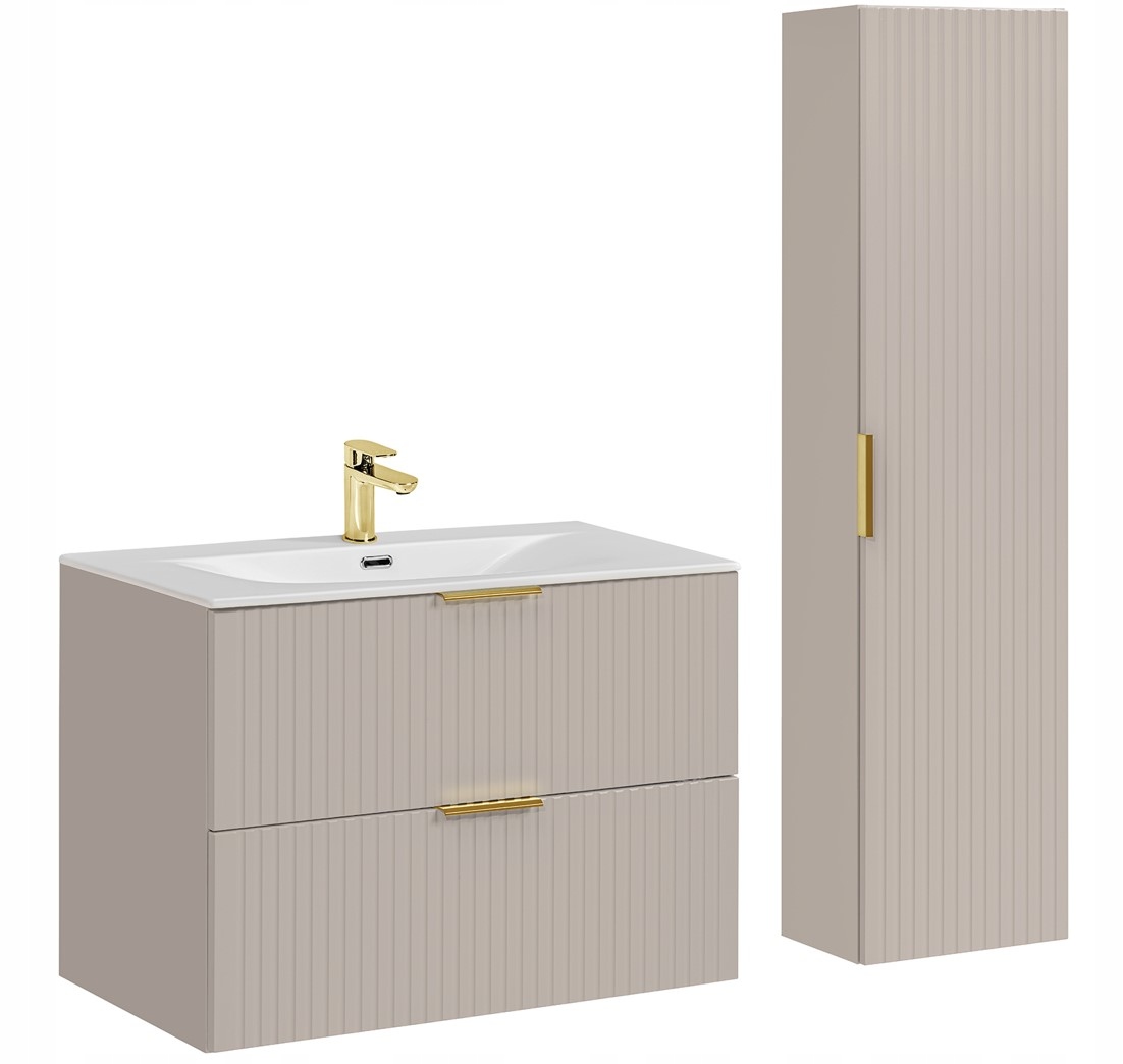 Zestaw łazienkowy ADEL w eleganckim kaszmirowym wykończeniu z ryflowanymi frontami to idealne rozwiązanie dla osób poszukujących nowoczesnego stylu i funkcjonalności. Zestaw zawiera wiszącą szafkę pod umywalkę o szerokości 80 cm, słupek oraz stylową umywalkę, co zapewnia doskonałe wykorzystanie przestrzeni i estetykę. Subtelne ryflowanie frontów dodaje elegancji, a dostępność trzech wariantów uchwytów (złoty połysk, chrom, czarny mat) pozwala na indywidualne dopasowanie.