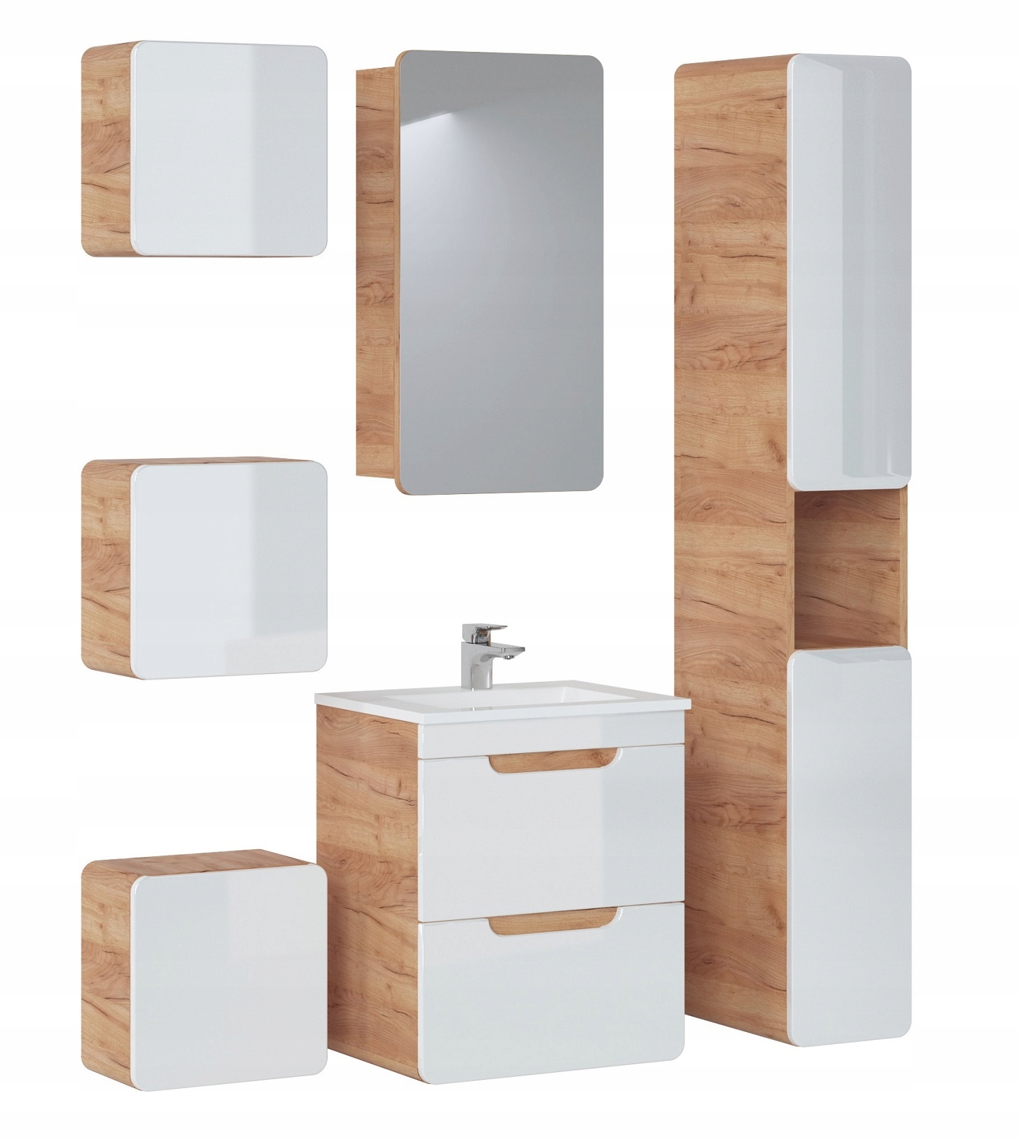 Zestaw mebli łazienkowych ARUBA DĄB CRAFT ZŁOTY to idealne rozwiązanie dla osób poszukujących nowoczesnych i funkcjonalnych rozwiązań do łazienki. Charakteryzuje się lekkim i eleganckim designem, który wprowadza do wnętrza klimat tropikalnego SPA. Połączenie korpusów w kolorze dębu z białymi, połyskliwymi frontami nadaje całości wyjątkowego stylu. Zaokrąglone kanty oraz fronty bez uchwytów nie tylko wyglądają nowocześnie, ale także są praktyczne w codziennym użytkowaniu.
