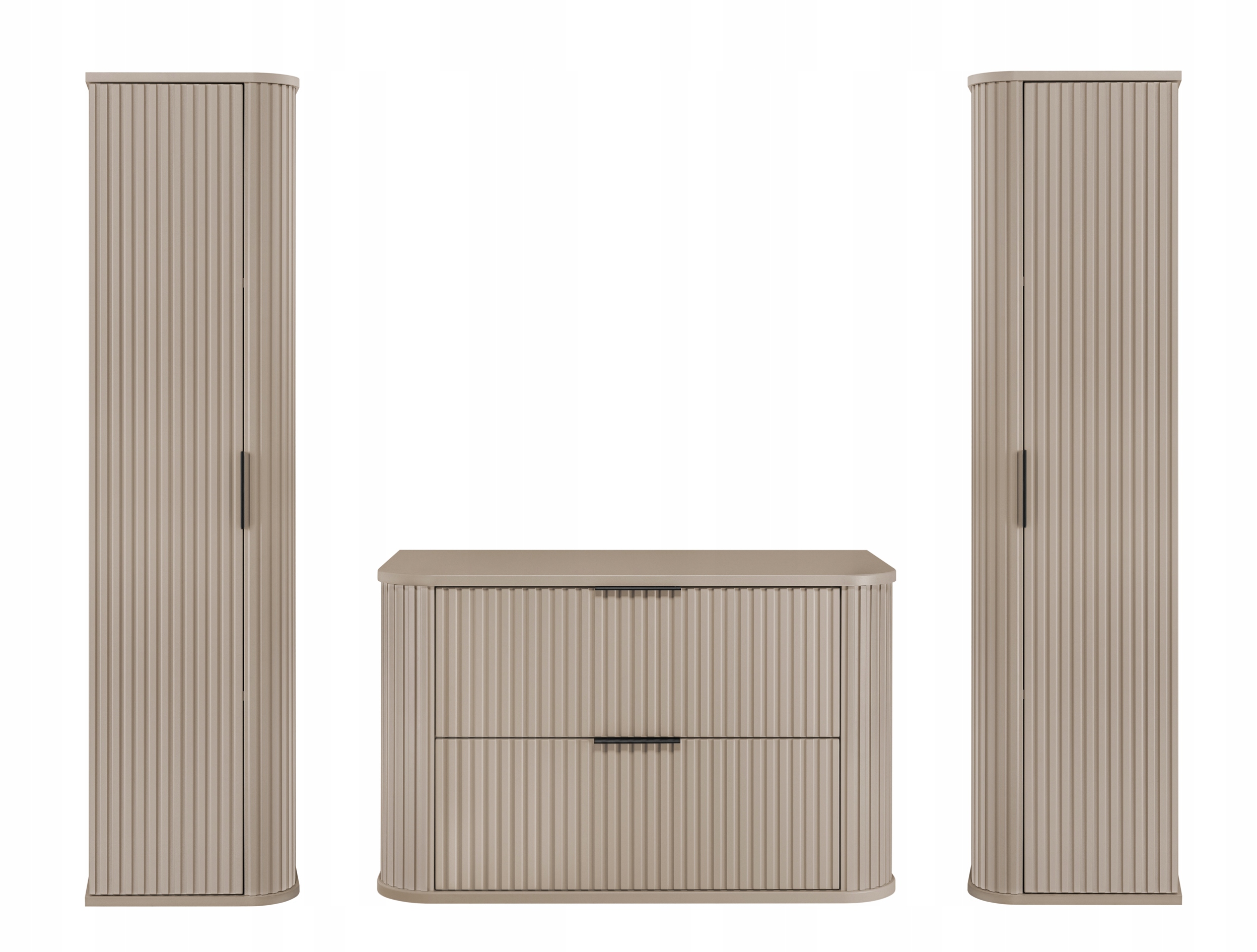 KASZMIROWY Zestaw Mebli Łazienkowych to połączenie elegancji i funkcjonalności, obejmujące ryflowaną szafkę pod umywalkę oraz dwa stylowe słupki. Idealnie wpisuje się w nowoczesny wystrój łazienki, dodając jej wyjątkowego charakteru.