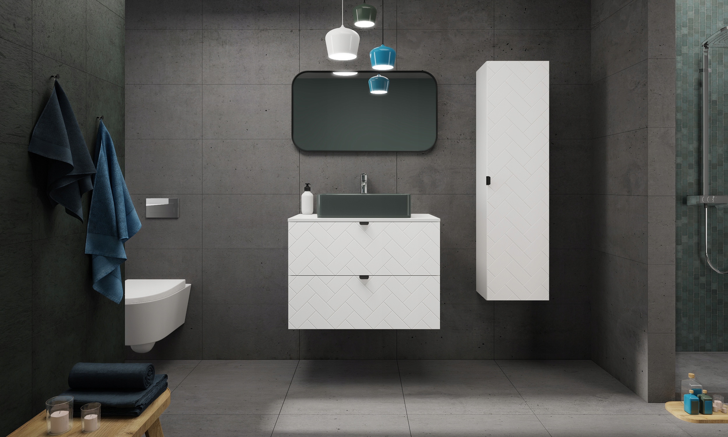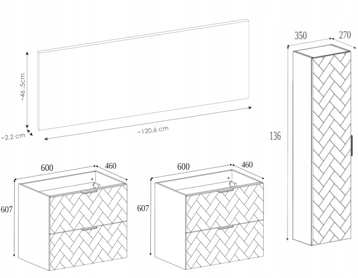 Zestaw łazienkowy MADIS to harmonijne połączenie designu i funkcjonalności, idealne dla wymagających użytkowników. Wyróżniający się subtelnym wzorem w kształcie jodełki, meble dodają elegancji każdemu wnętrzu.