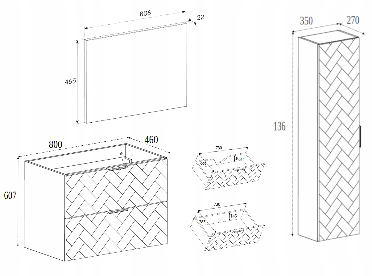 Zestaw łazienkowy MADIS to wyjątkowe połączenie designu i funkcjonalności, stworzone z myślą o wymagających użytkownikach. Subtelny wzór w kształcie jodełki nadaje meblom unikalny wygląd, który wzbogaca wnętrze elegancją.