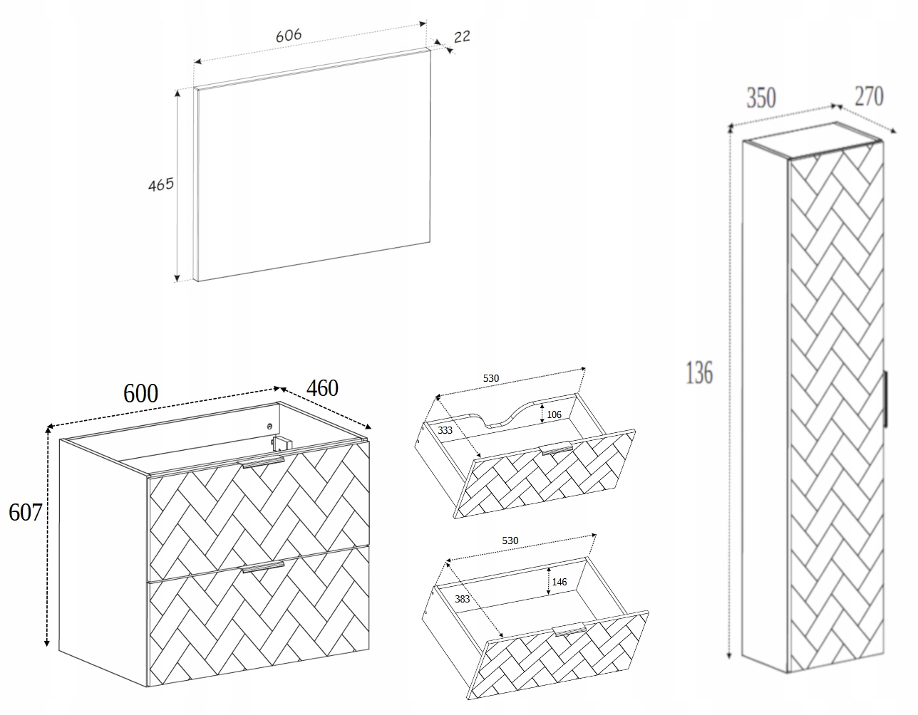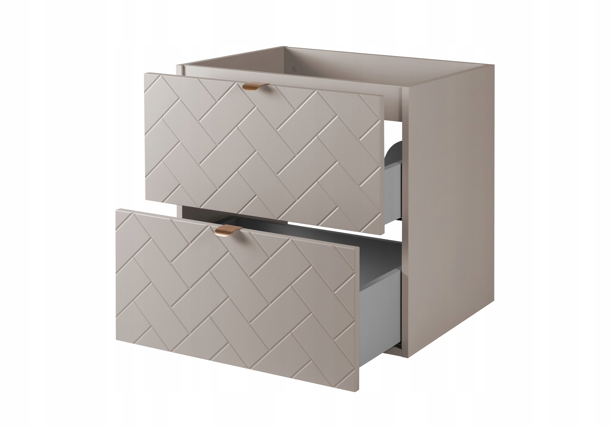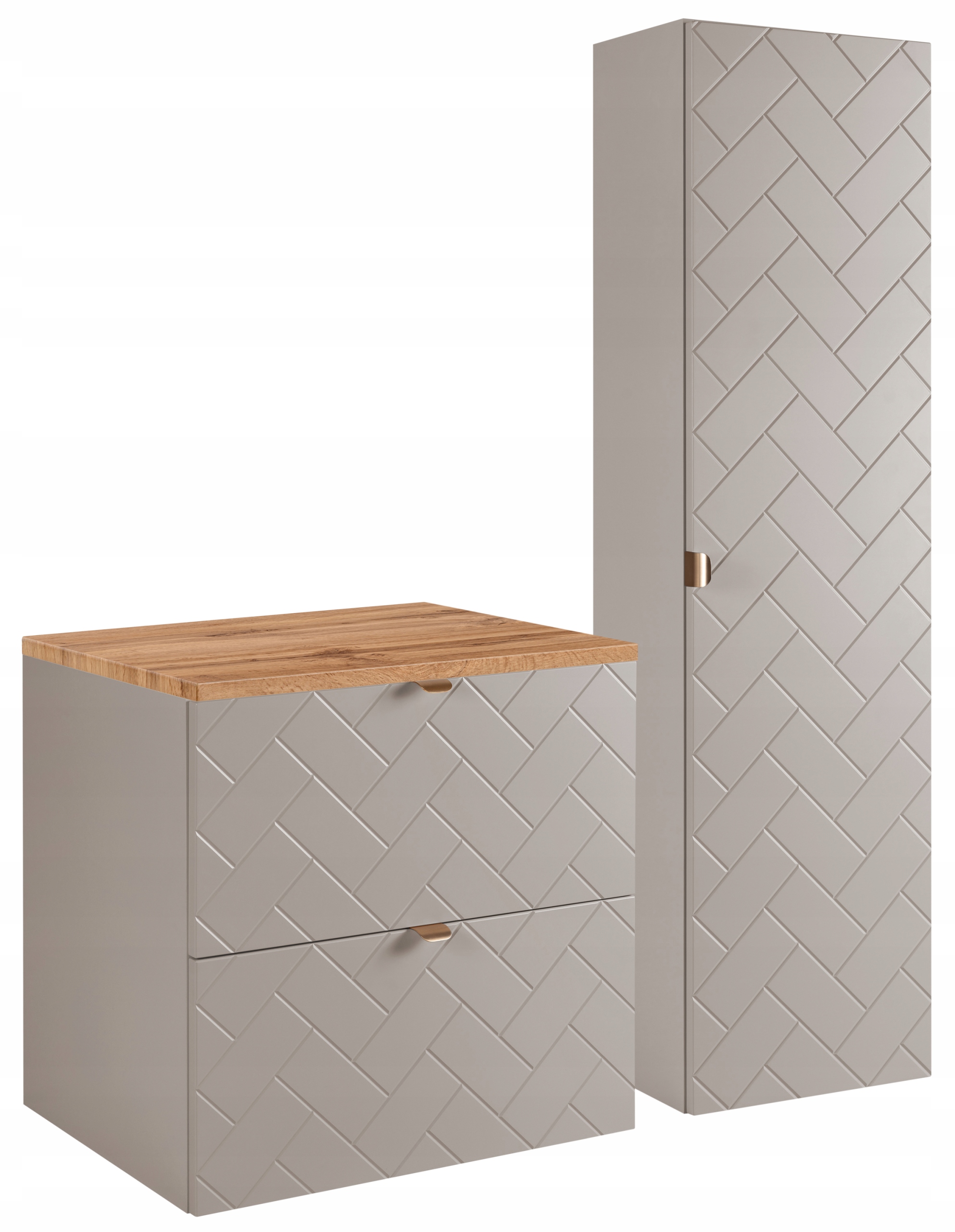 Zestaw mebli łazienkowych KASZMIR to idealne połączenie elegancji i funkcjonalności. W skład zestawu wchodzi szafka pod umywalkę o szerokości 60 cm oraz wysoki słupek, który oferuje dodatkową przestrzeń do przechowywania. Dzięki subtelnemu wzorowi w kształcie jodełki, meble te nadadzą Twojej łazience unikalny charakter i styl. Zestaw zapewnia również komfort użytkowania dzięki mechanizmowi cichego domyku w szufladach i drzwiach.