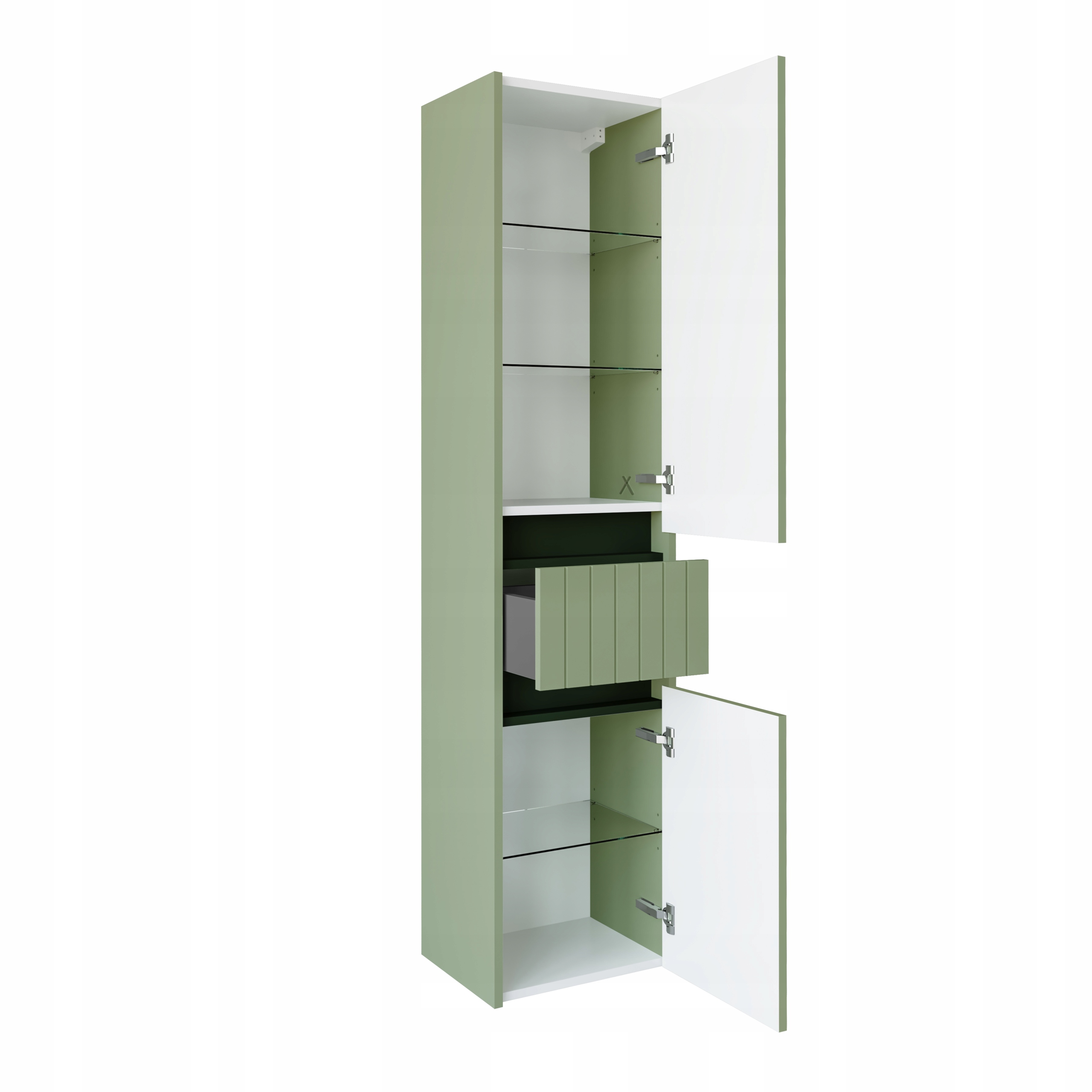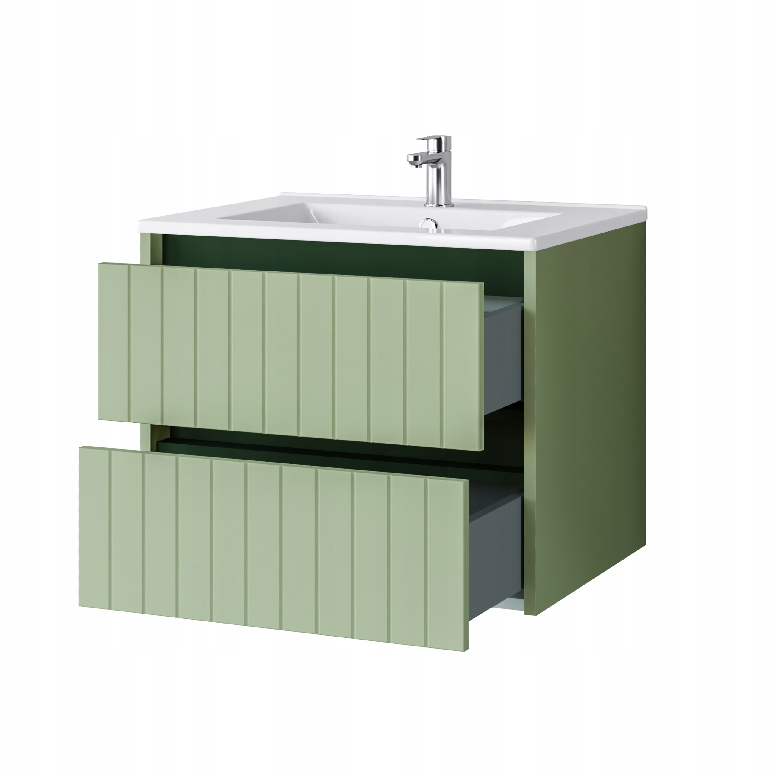 Kolekcja Mebli Łazienkowych Line to harmonijne połączenie elegancji, funkcjonalności i nowoczesnego stylu. Matowe wykończenie w głębokim odcieniu zieleni, subtelnie frezowane fronty oraz system cichego domyku tworzą spójną i estetyczną całość. Meble wykonane z wytrzymałego MDF są odporne na wilgoć i codzienne użytkowanie, a dzięki wiszącej formie oraz gotowemu montażowi idealnie sprawdzą się w każdej łazience. Prezentowany zestaw z szafką 60 cm, umywalką i słupkiem to praktyczne i stylowe rozwiązanie dla mniejszych przestrzeni.