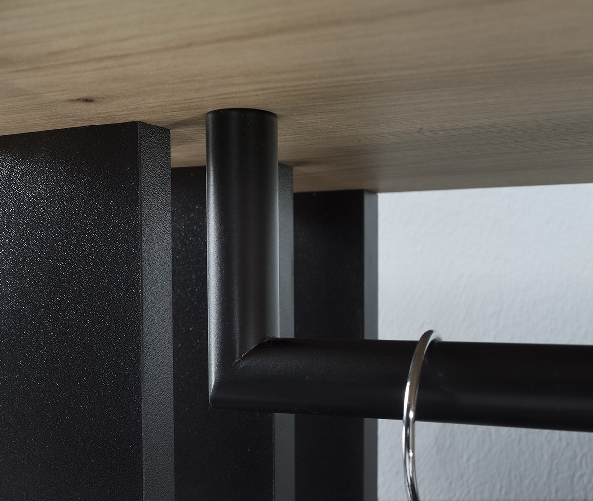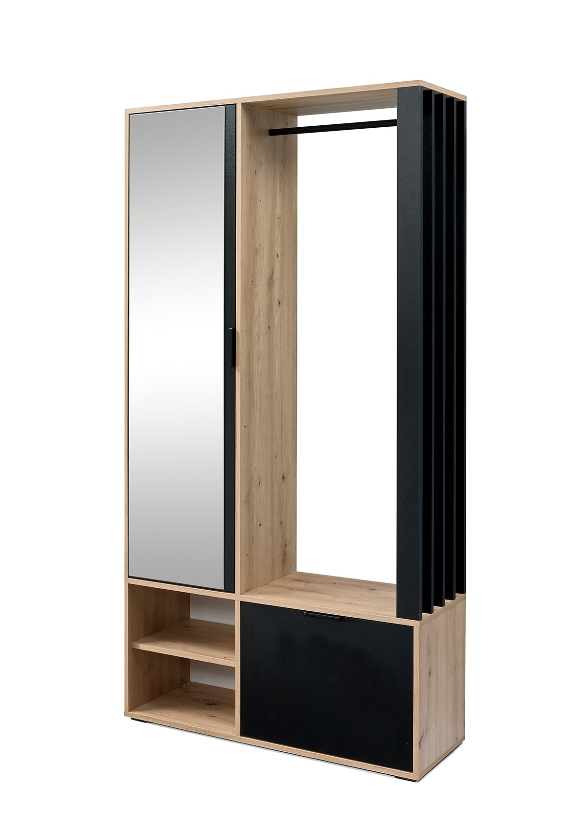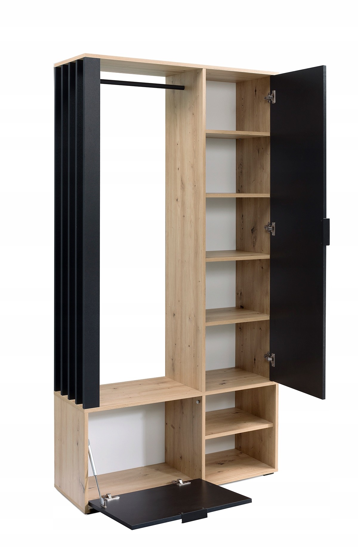 Przedpokój VENNA to idealne rozwiązanie dla osób ceniących elegancki design i praktyczność. Nowoczesne lamelowe wstawki w kolorze czarnym doskonale komponują się z wykończeniem w odcieniu artisan, nadając wnętrzu wyjątkowy charakter. Lustro nie tylko powiększa optycznie przestrzeń, ale także stanowi praktyczny element, niezbędny w każdej garderobie.