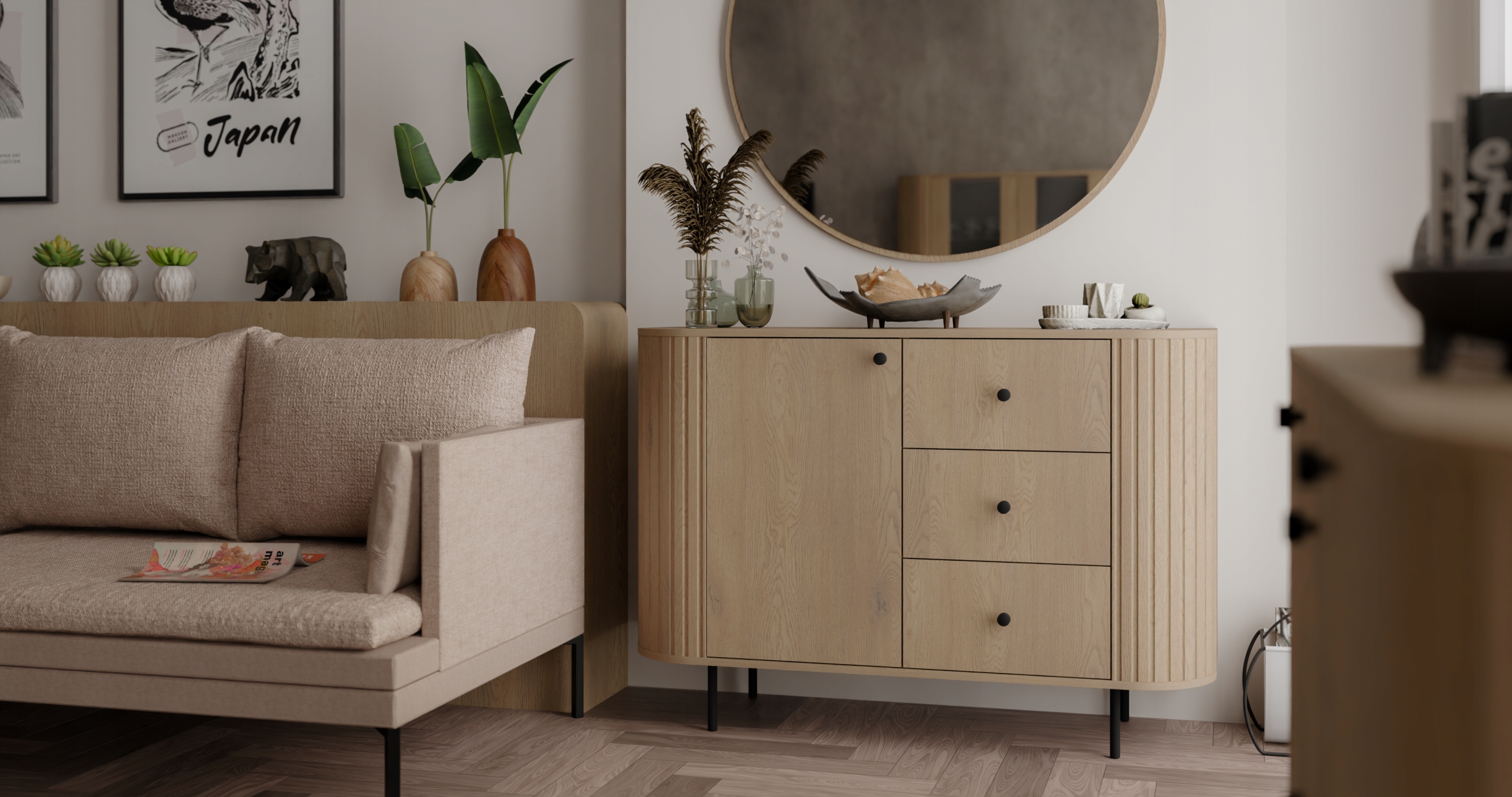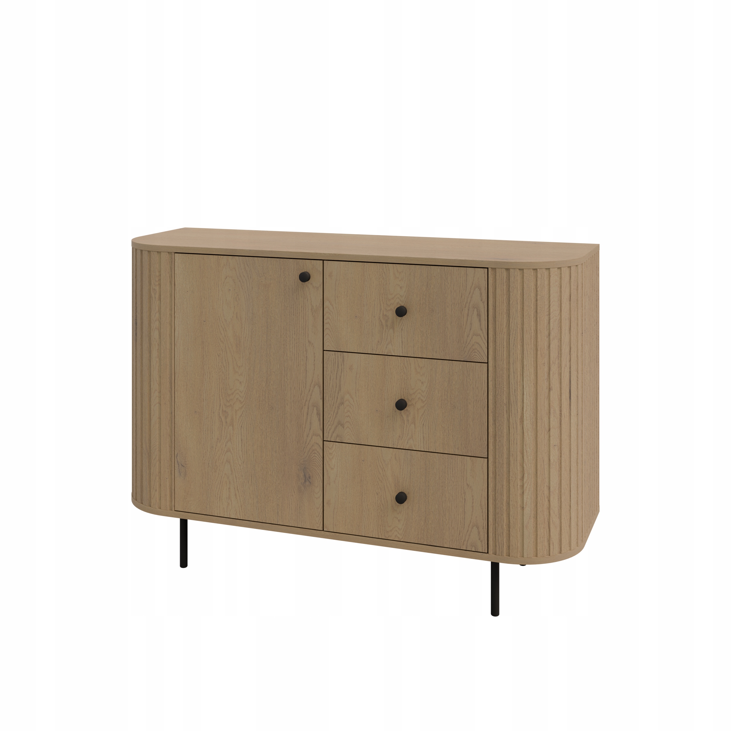 Komoda OVALIO została zaprojektowana tak, aby łączyć estetykę z funkcjonalnością. Jedna szafka oraz trzy pojemne szuflady zapewniają wygodne miejsce do przechowywania i pozwalają uporządkować przedmioty codziennego użytku. Szeroki blat może pełnić funkcję dekoracyjną lub użytkową, a konstrukcja osadzona na metalowych nogach o wysokości 15 cm nadaje bryle lekkości oraz ułatwia utrzymanie czystości pod meblem.