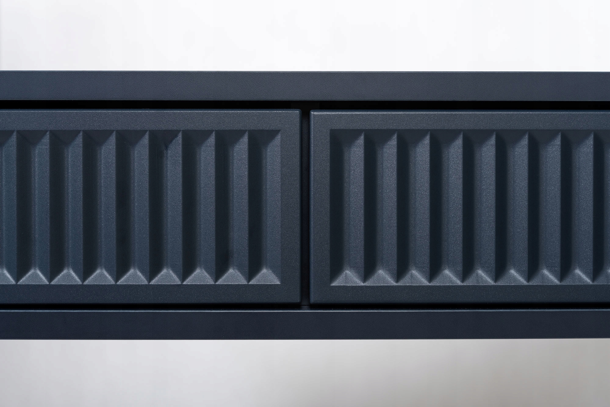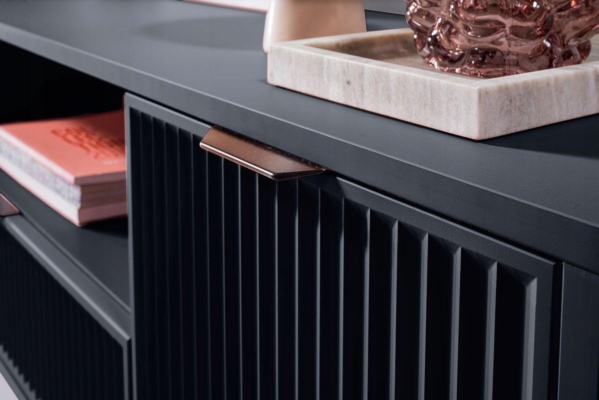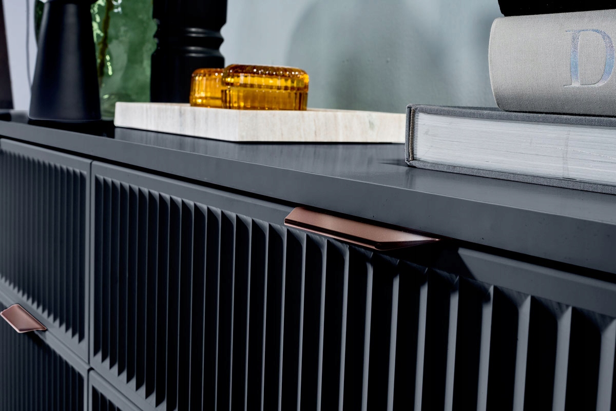 Eleganckie frezowane fronty nadają meblowi wyjątkowego charakteru, a metalowe nóżki w kolorze czarnym zapewniają stabilność i nowoczesny wygląd. Szuflady z cichym domykiem zapewniają komfort użytkowania, a uchwyty w kolorze miedzi dodają wyrafinowanego stylu.