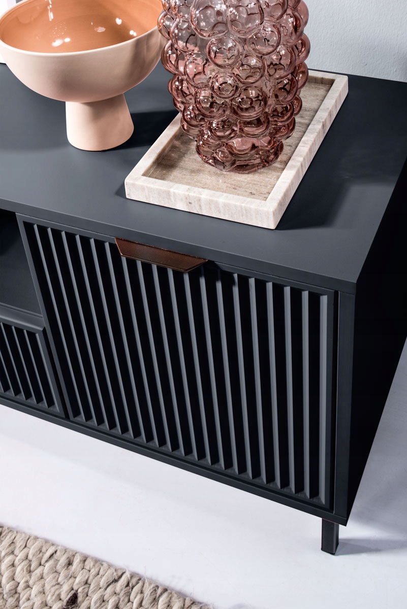 Frezowane fronty dodają meblowi wyjątkowego charakteru, a metalowe nóżki w kolorze czarnym zapewniają nowoczesny wygląd i stabilność. Szuflady z funkcją cichego domyku gwarantują komfort użytkowania, a uchwyty w kolorze miedzi podkreślają elegancki styl mebla.