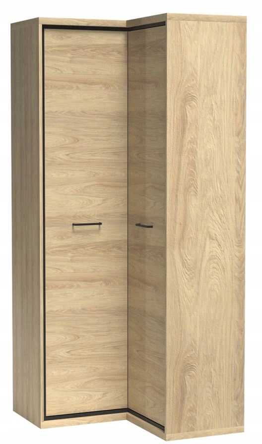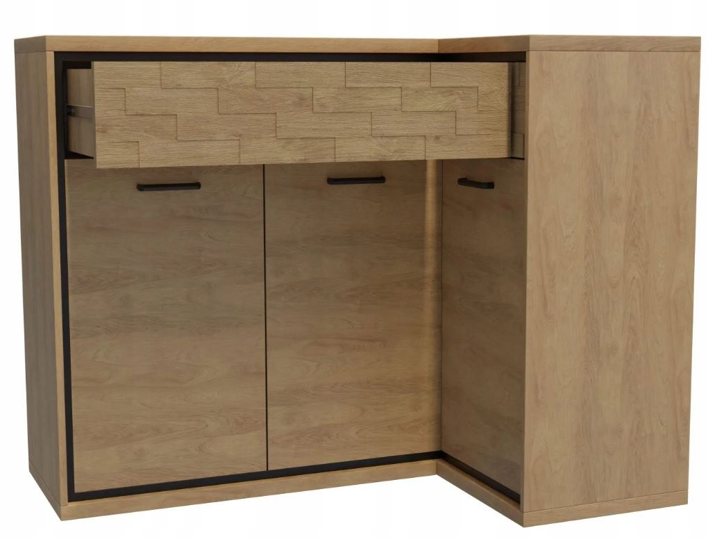 Komoda Narożna z kolekcji MILAN to doskonałe połączenie nowoczesnego stylu z funkcjonalnością, idealna do salonu lub jadalni. Wyposażona w 2 szuflady i półki, oferuje dużo miejsca do przechowywania, a metalowe nóżki o wysokości 10 cm dodają jej industrialnego charakteru. System PUSH TO OPEN i CICHY DOMYK drzwi zapewniają wygodę i komfort użytkowania. Obrzeże ABS chroni krawędzie, a wykończenie w kolorze Natural Hikora nadaje wnętrzu ciepłego i eleganckiego wyglądu. To stylowe i praktyczne rozwiązanie dla osób ceniących wyjątkowy design i jakość.