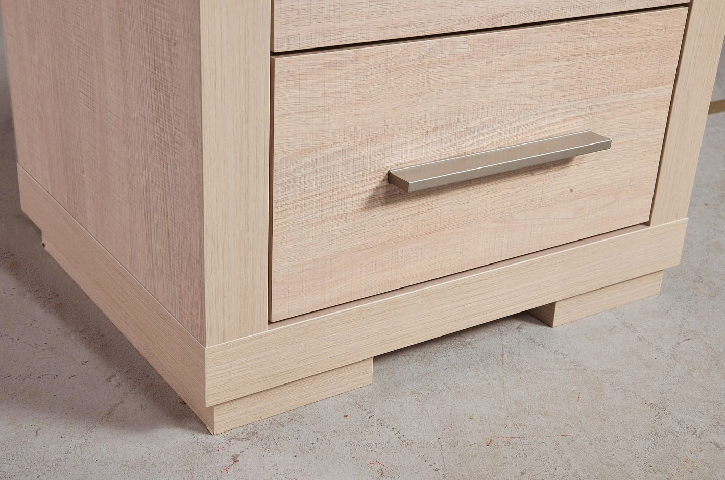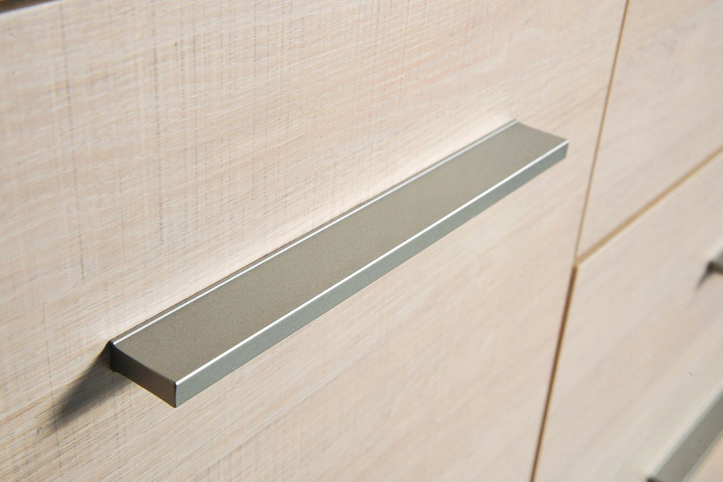 Komoda wysoka z kolekcji SAGEV w kolorze santana jasna to eleganckie i funkcjonalne rozwiązanie do sypialni lub salonu. Wyposażona w szuflady z pełnym wysuwem oraz drzwi, oferuje wygodne przechowywanie i łatwy dostęp do przedmiotów. Metalowe uchwyty dodają nowoczesnego stylu, a obrzeża ABS zwiększają trwałość. Pogrubione blaty i boki podkreślają solidność konstrukcji, tworząc mebel idealny do różnych aranżacji wnętrz, łączący styl i praktyczność.