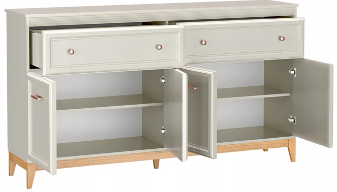 Komoda WINDSOR 179 4D2S to wyjątkowe połączenie klasycznej elegancji i współczesnego wzornictwa. Subtelne frezowane fronty z płyty MDF, dekoracyjna listwa podblatowa oraz ciepły odcień kaszmiru (EGER U702) tworzą harmonijną i przytulną całość. Mebel doskonale komponuje się z wnętrzami urządzonymi zarówno w stylu klasycznym, jak i nowoczesnym.