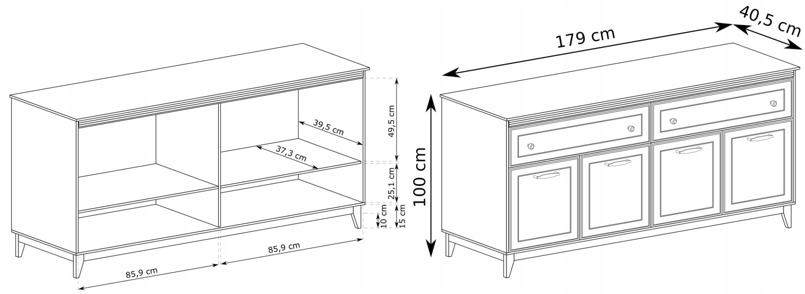 • Komoda WINDSOR 179 4D2S – szerokość: 179 cm, wysokość: 100 cm, głębokość: 40,5 cm