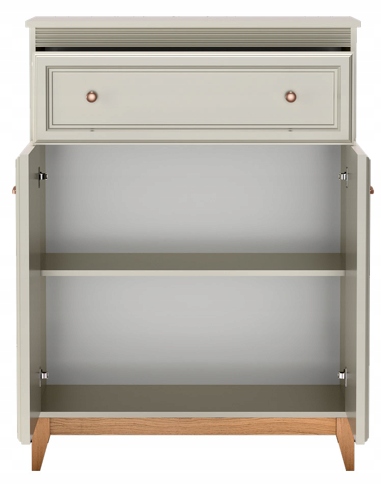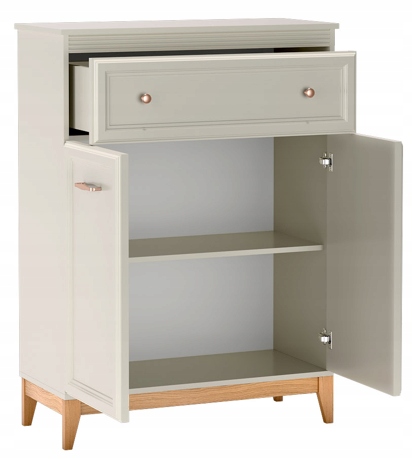Korpus komody wykonano z laminowanej płyty meblowej EGER U702, a fronty z frezowanej płyty MDF. Detale, takie jak miedziane metalowe uchwyty, podkreślają wyjątkowy charakter kolekcji. Mebel dostarczany jest w paczkach do samodzielnego montażu – w zestawie znajduje się instrukcja oraz komplet okuć.