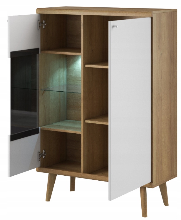 Kolekcja PRIMO to harmonijne połączenie nowoczesnych linii i ciepłych, naturalnych dekorów. Fronty w kolorze białym kontrastują z korpusami w dekorze dąb riviera, tworząc świeży i elegancki zestaw, który doskonale sprawdzi się w salonie, jadalni, sypialni czy biurze. Charakterystycznym elementem kolekcji są dekoracyjne listwy MDF, które podkreślają formę mebli i dodają im wyrazistości.