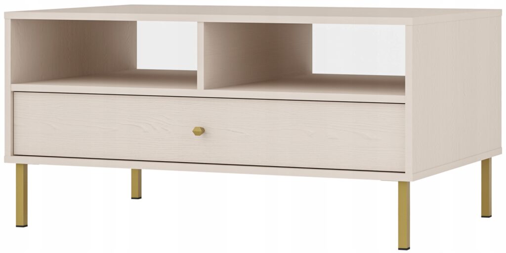 System mebli MONO to doskonała propozycja dla miłośników stylu loftowego w delikatnym, piaskowym wydaniu. Kolekcja wyróżnia się beżową kolorystyką, która wnosi do wnętrza ciepło i subtelność, a kontrastowe połączenie złotych uchwytów z czarnymi, metalowymi nóżkami nadaje bryłom nowoczesnego, wyrazistego charakteru.