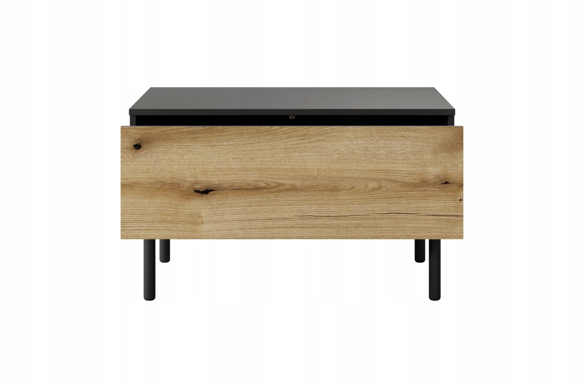 Ława ARIA to stylowy i funkcjonalny stolik kawowy, idealny do salonu czy pokoju dziennego. Dzięki jednej pojemnej szufladzie umożliwia przechowywanie drobnych przedmiotów, takich jak piloty, czasopisma czy inne akcesoria, co ułatwia utrzymanie porządku i zapewnia wygodny dostęp. Stolik zachwyca nowoczesnym połączeniem kolorów – dębu evoke i głębokiej czerni – co nadaje mu wyrazisty, elegancki wygląd, doskonały do wnętrz w stylu industrialnym czy minimalistycznym.