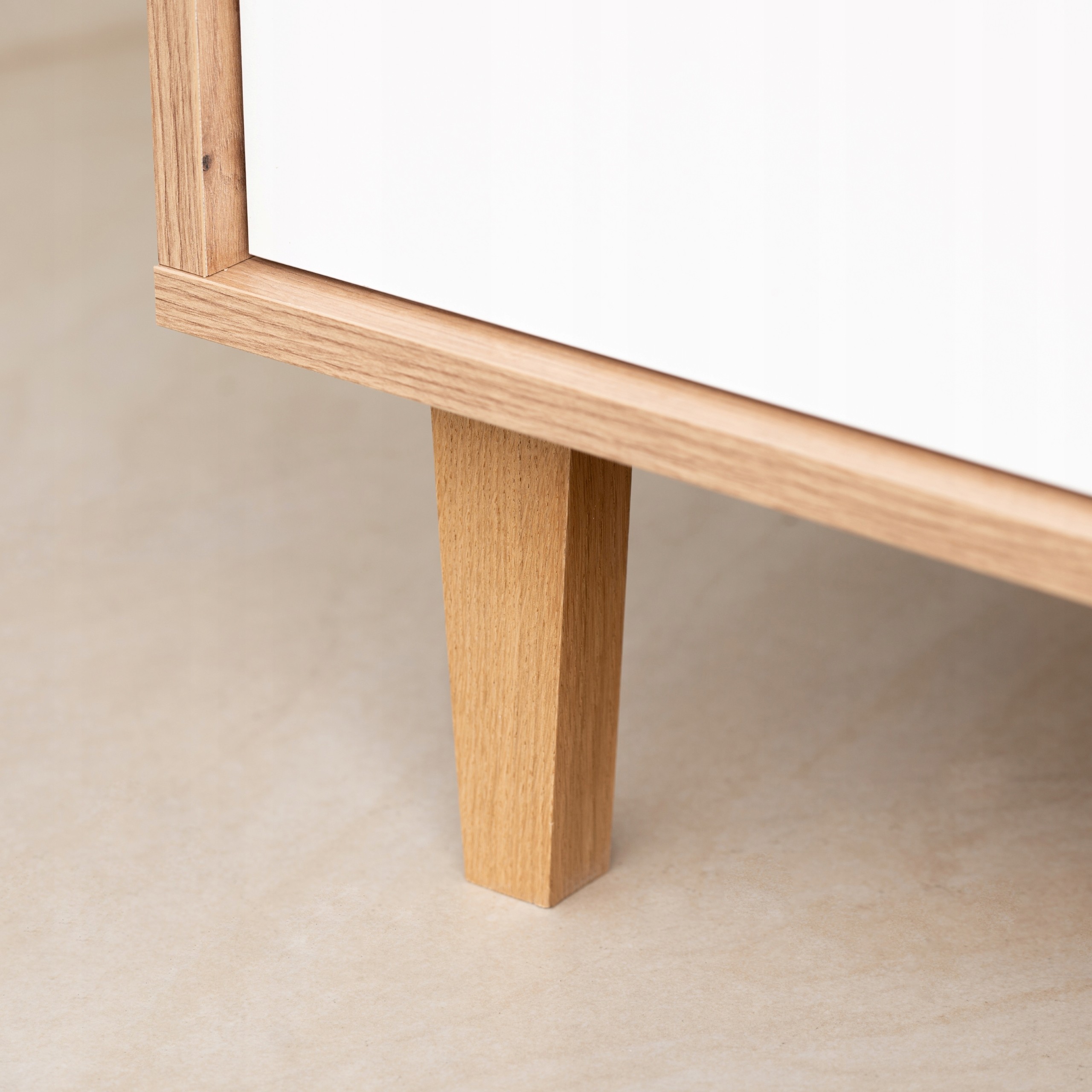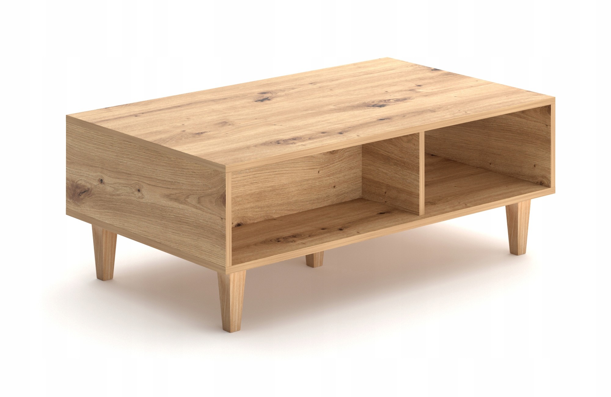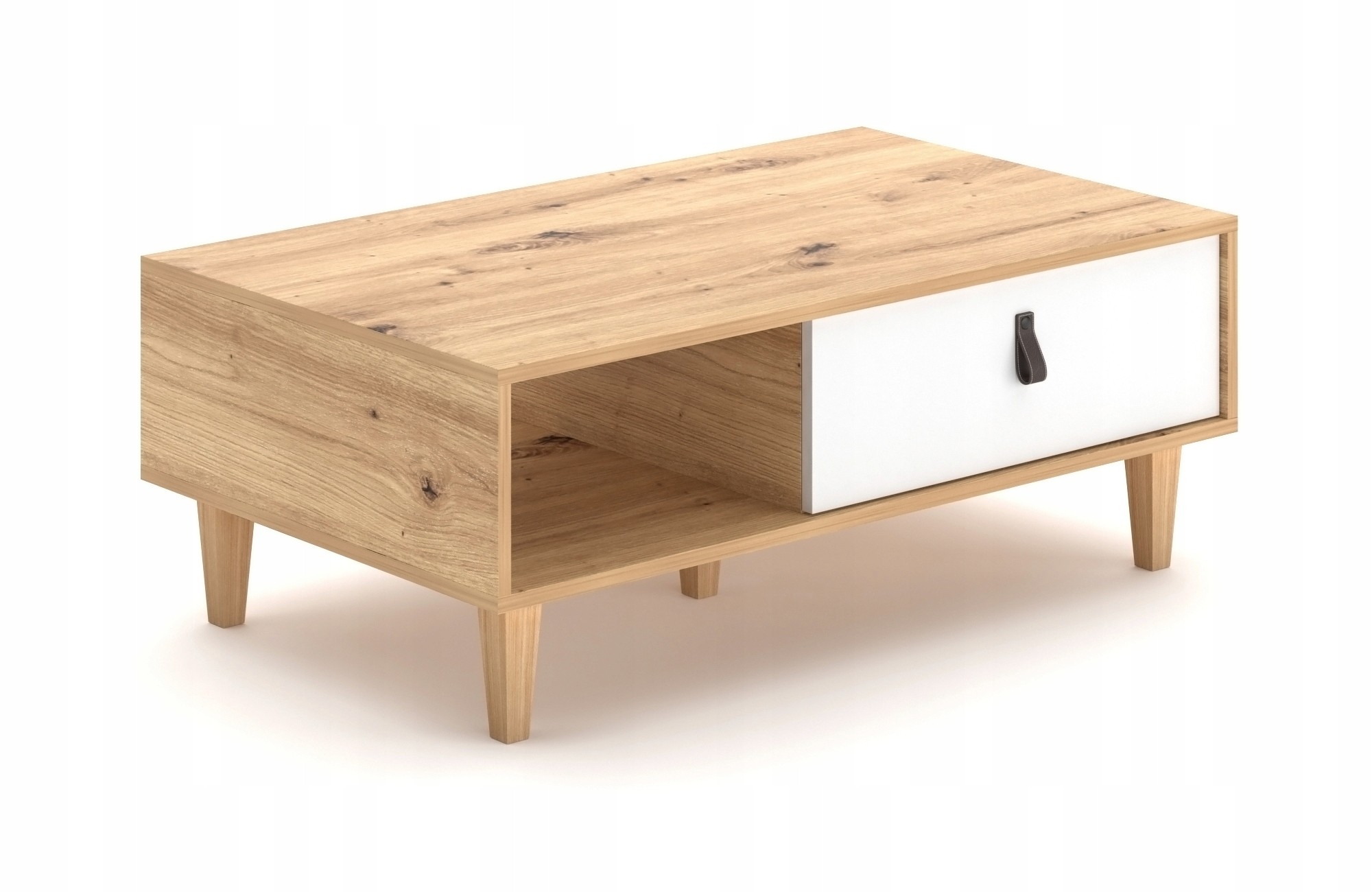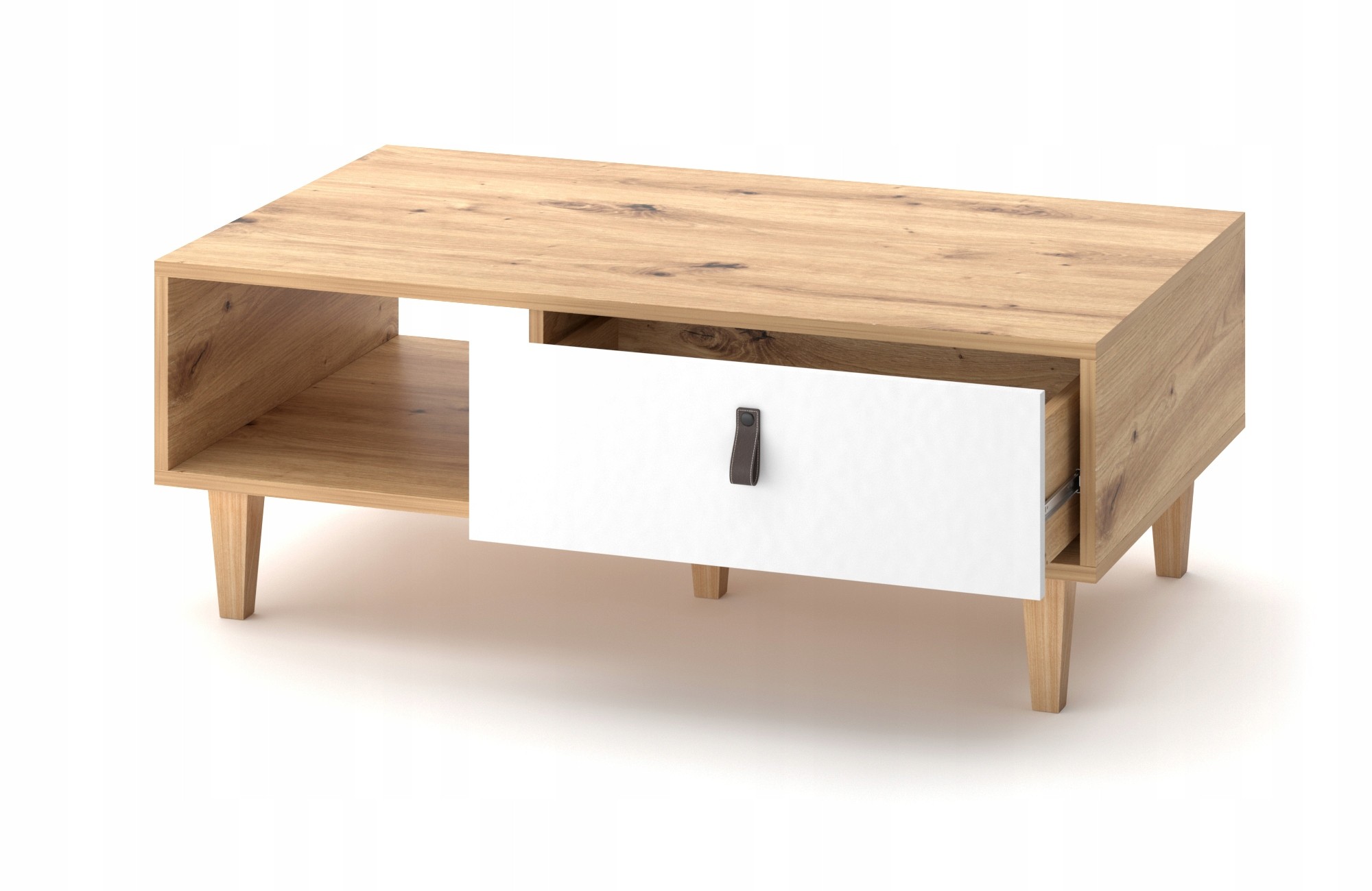 Ława do salonu z systemu Bari, o szerokości 100 cm, to nowoczesny mebel w stylu skandynawskim, wykonany z płyty laminowanej w kolorze dąb Artisan z białym frontem w macie. Stolik kawowy posiada funkcjonalną szufladę z kulkowymi prowadnicami oraz dębowe nóżki, co dodaje mu stabilności i elegancji. Uchwyty z brązowej eko-skóry w połączeniu z cichym domykaniem szuflady zapewniają wygodę użytkowania. Obrzeża wykończone ABS-em zwiększają odporność mebla na uszkodzenia mechaniczne, co czyni go trwałym i praktycznym rozwiązaniem do nowoczesnych wnętrz.