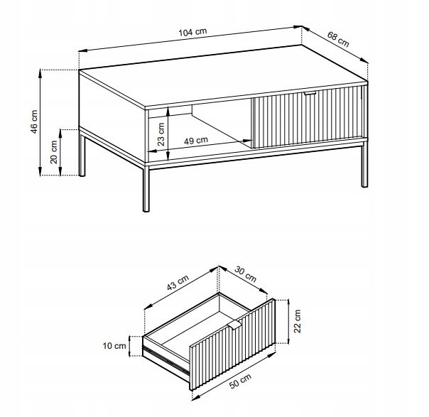 Stolik kawowy BELLAZA wyróżnia się frezowanymi frontami, które podkreślają nowoczesny wygląd mebla, a złote uchwyty oraz metalowe nóżki w czarnym kolorze tworzą elegancką kompozycję. Ława jest nie tylko ozdobą pomieszczenia, ale również praktycznym elementem – dwie szuflady zapewniają dodatkową przestrzeń do przechowywania, a dolna półka doskonale nadaje się na magazyny, piloty czy inne akcesoria.