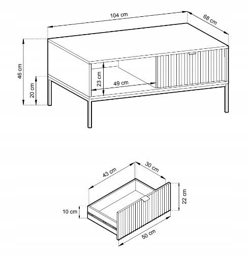 Ten praktyczny stolik oferuje dwie szuflady i półkę, które zapewniają dodatkowe miejsce do przechowywania, pomagając utrzymać porządek w salonie. Trwała konstrukcja, wzmocniona obrzeżem ABS, gwarantuje długotrwałe użytkowanie. Złote uchwyty oraz stalowy stelaż malowany proszkowo podkreślają nowoczesny charakter mebla.