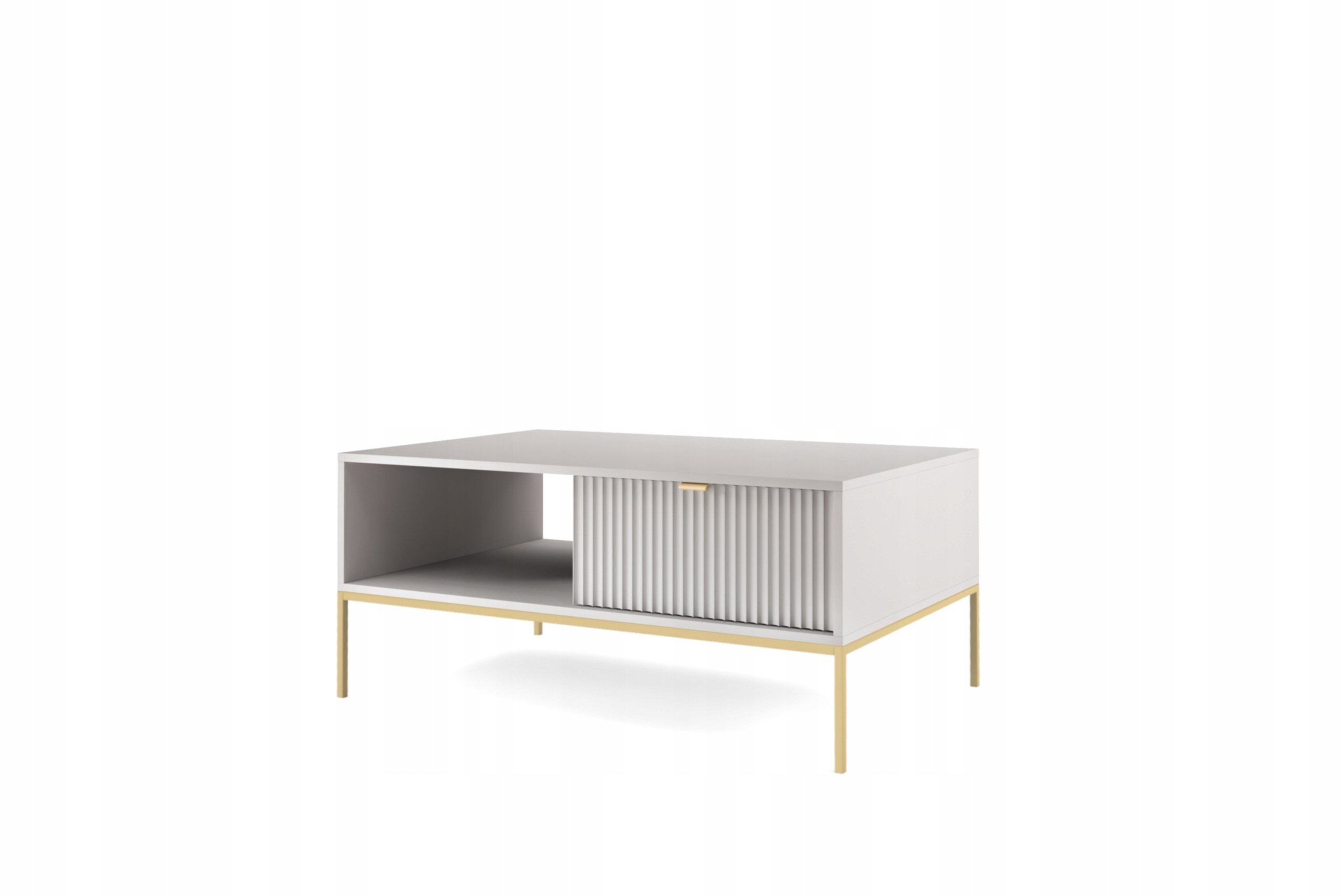 Ława z kolekcji BELLAZA to elegancki stolik kawowy, który łączy nowoczesny design z funkcjonalnością. Frezowane fronty nadają meblowi wyrazistości, a złote metalowe nóżki w stylu loftowym dodają luksusowego wyglądu, jednocześnie ułatwiając sprzątanie, nawet przy użyciu odkurzacza automatycznego.