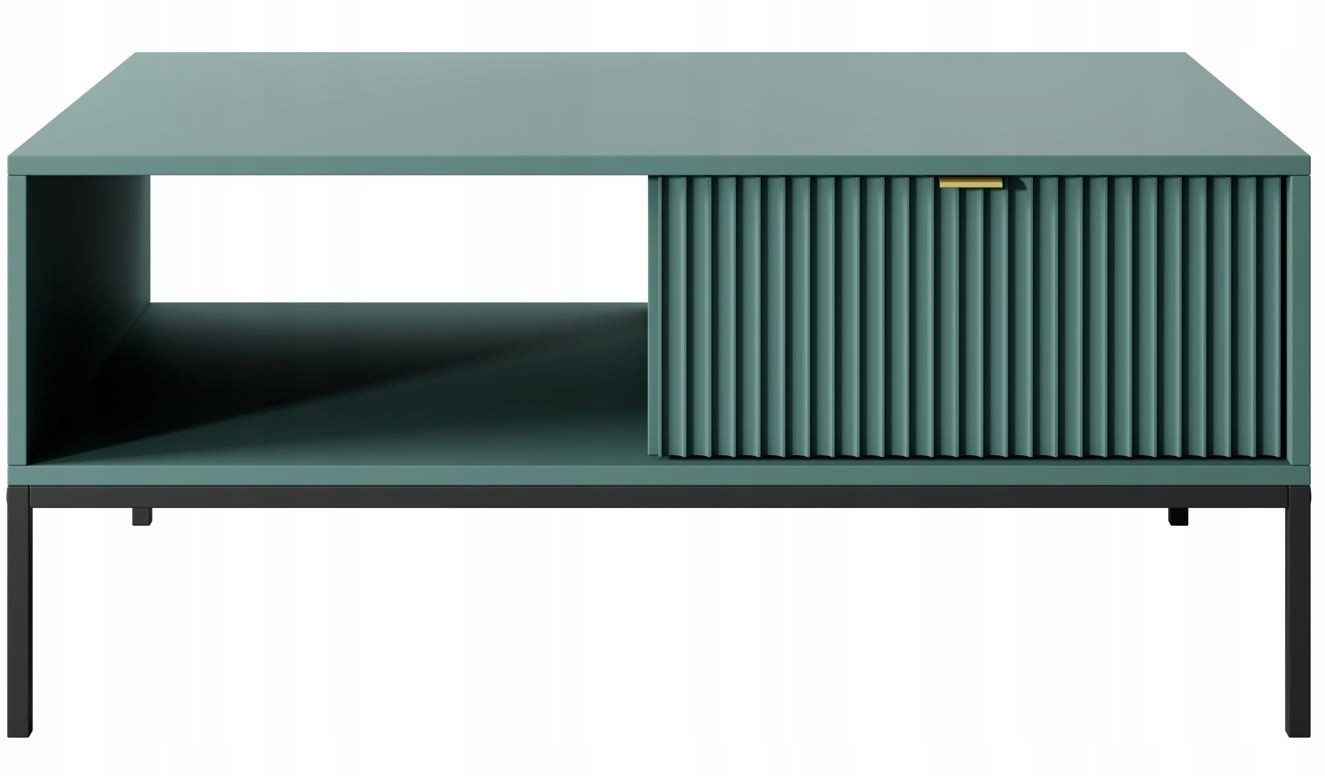 Zielona Ława BELLAZA to wyrafinowany stolik kawowy, który doskonale uzupełni Twój salon lub pokój dzienny. Ryflowane fronty i elegancki kolor labrador nadają meblowi nowoczesny, a zarazem luksusowy wygląd. Dwie praktyczne szuflady zapewniają przestrzeń do przechowywania, a złote uchwyty wprowadzają do wnętrza odrobinę blasku i elegancji. Metalowe nogi w kolorze czarnym, malowane proszkowo, kontrastują z całą kompozycją, dodając stabilności i stylu. To połączenie funkcjonalności i estetyki, które wniesie do Twojego wnętrza klasę i nowoczesny charakter.