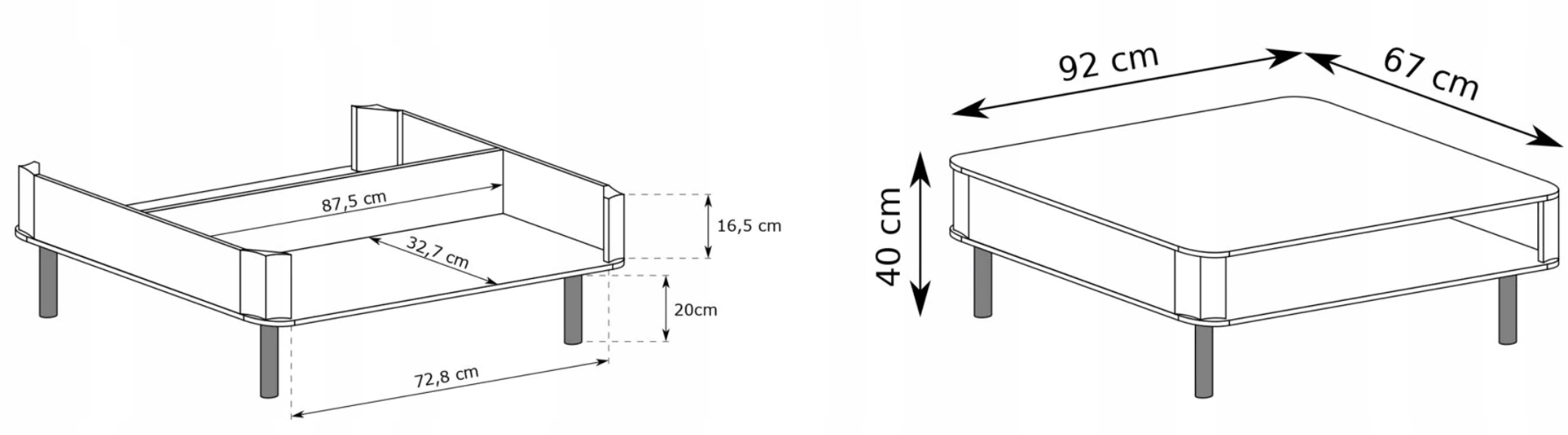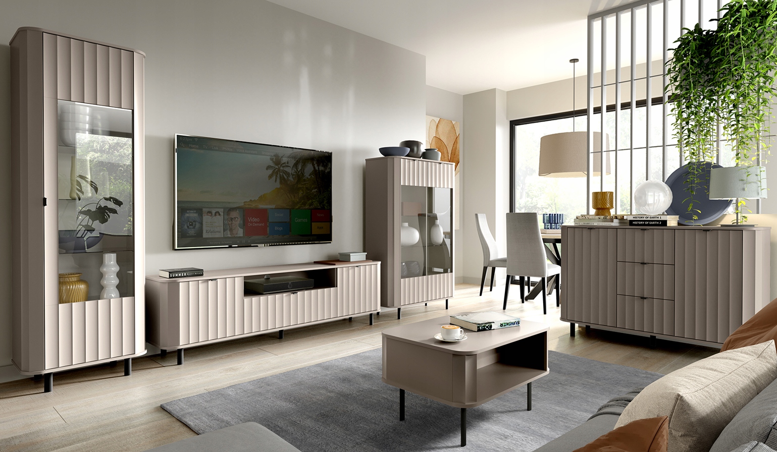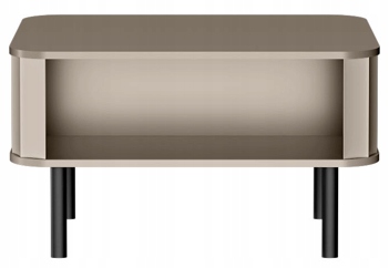 Korpus wykonano z trwałej, laminowanej płyty meblowej w odcieniu Clay Gray, a fronty z frezowanego MDF wykończonego folią. Obrzeża zabezpieczono okleiną ABS, co zwiększa odporność na codzienne użytkowanie. Praktyczne wnęki pod blatem pozwalają na przechowywanie książek, pilotów czy drobnych akcesoriów, utrzymując porządek w strefie wypoczynku.