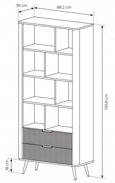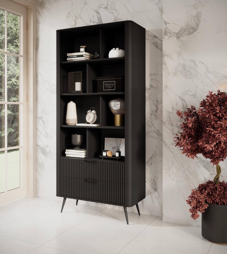 Regał z kolekcji LANTE w głębokim, matowym czarnym wykończeniu to stylowa propozycja do nowoczesnych i eleganckich wnętrz. Prosta bryła została wzbogacona o frezowane fronty dolnych szuflad oraz zaokrąglone boczne listwy, które dodają całości lekkości i dekoracyjnego charakteru. Czarne detale w postaci metalowych uchwytów i walcowatych nóżek podkreślają spójność kolorystyczną i nadają meblowi wyrazistości. Regał oferuje aż osiem otwartych półek oraz dwie pojemne szuflady na pełnym wysuwie, co sprawia, że świetnie sprawdzi się jako domowa biblioteczka, miejsce na dekoracje lub funkcjonalny mebel do przechowywania w salonie, gabinecie czy sypialni. Wykonany z trwałych materiałów, zapewnia stabilność i estetyczny wygląd przez długi czas. Regał przeznaczony jest do samodzielnego montażu i został wyprodukowany w Polsce.