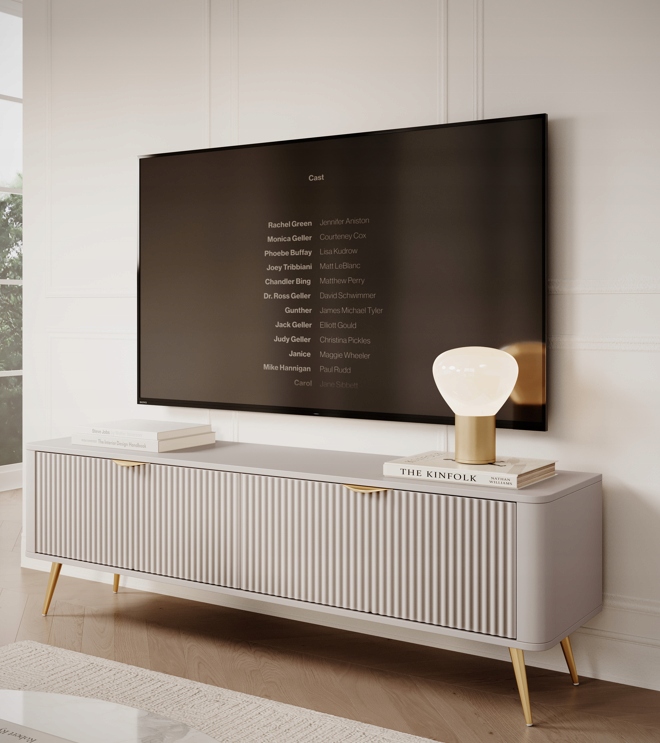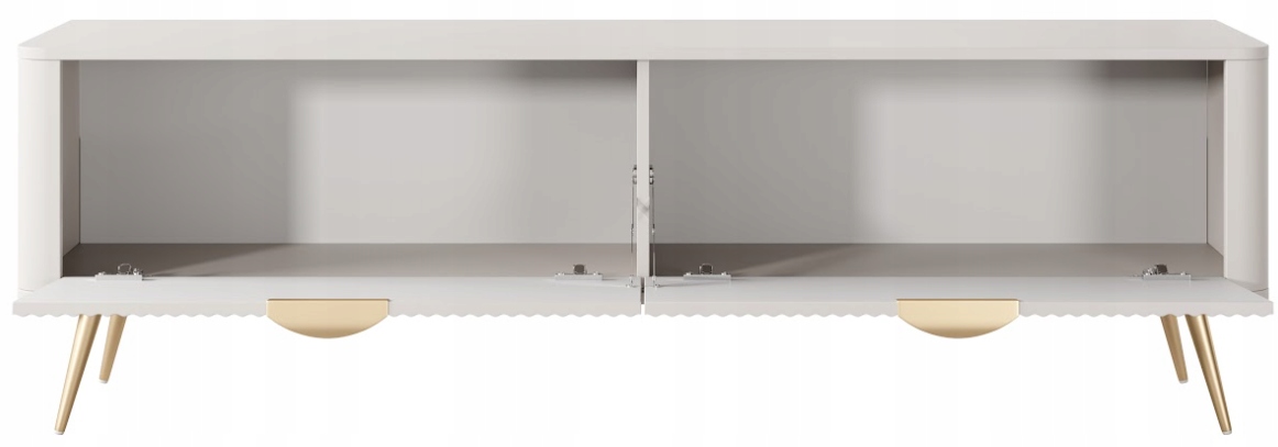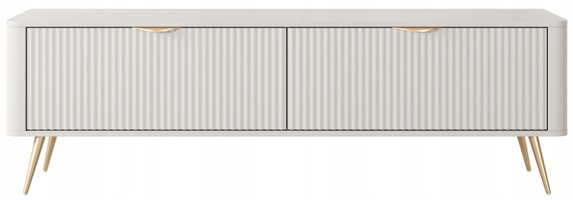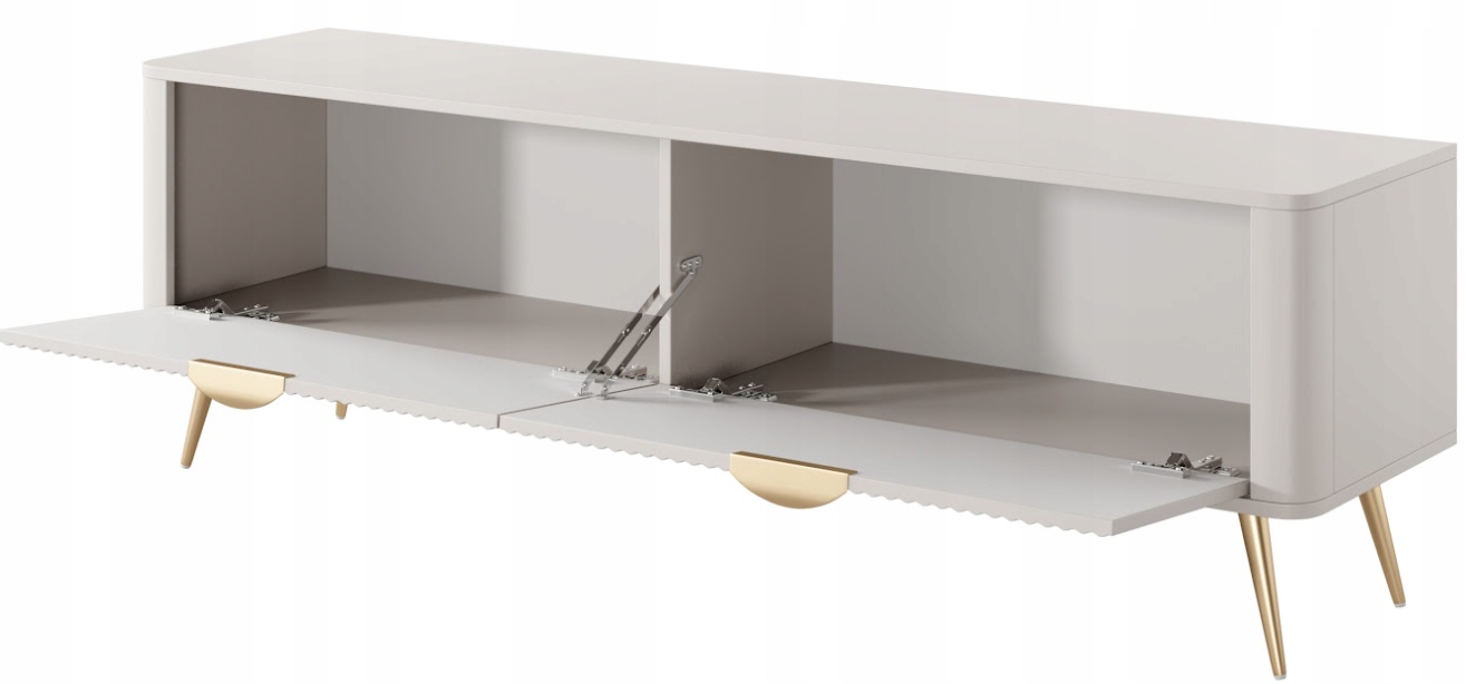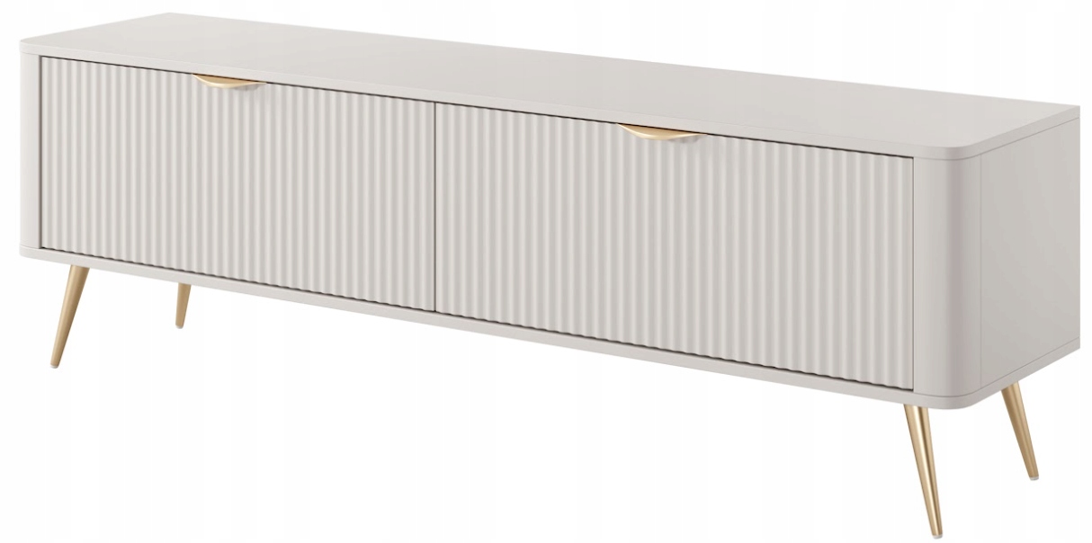 Szafka RTV z kolekcji LANTE to wyjątkowe połączenie elegancji i funkcjonalności, które idealnie wpisuje się w nowoczesne wnętrza z nutą glamour. Beżowe wykończenie nadaje aranżacji spokoju i subtelności, a złote uchwyty i wysokie, walcowate nóżki dodają bryle lekkości i wyrafinowanego stylu. Frezowane fronty oraz zaokrąglone listwy boczne podkreślają nowoczesny charakter mebla, tworząc efektowną całość, która pięknie prezentuje się zarówno w salonie, jak i w sypialni z telewizorem. Szafka wyposażona jest w dwa zamykane schowki z półkami, które pomieszczą sprzęt RTV, akcesoria lub dokumenty, pomagając utrzymać przestrzeń w czystości i porządku. Fronty wykonano z frezowanej płyty MDF, korpus z trwałej płyty laminowanej, a zaokrąglone elementy boczne z MDF. Obrzeża zabezpieczono trwałą okleiną ABS. Metalowe uchwyty i nogi w złotym kolorze zapewniają stabilność i estetyczne wykończenie. Mebel przeznaczony jest do samodzielnego montażu i został wyprodukowany w Polsce.