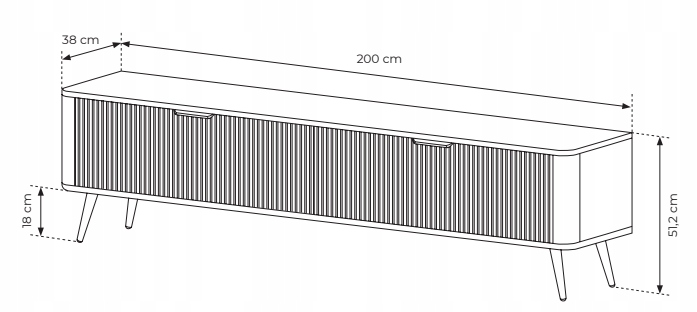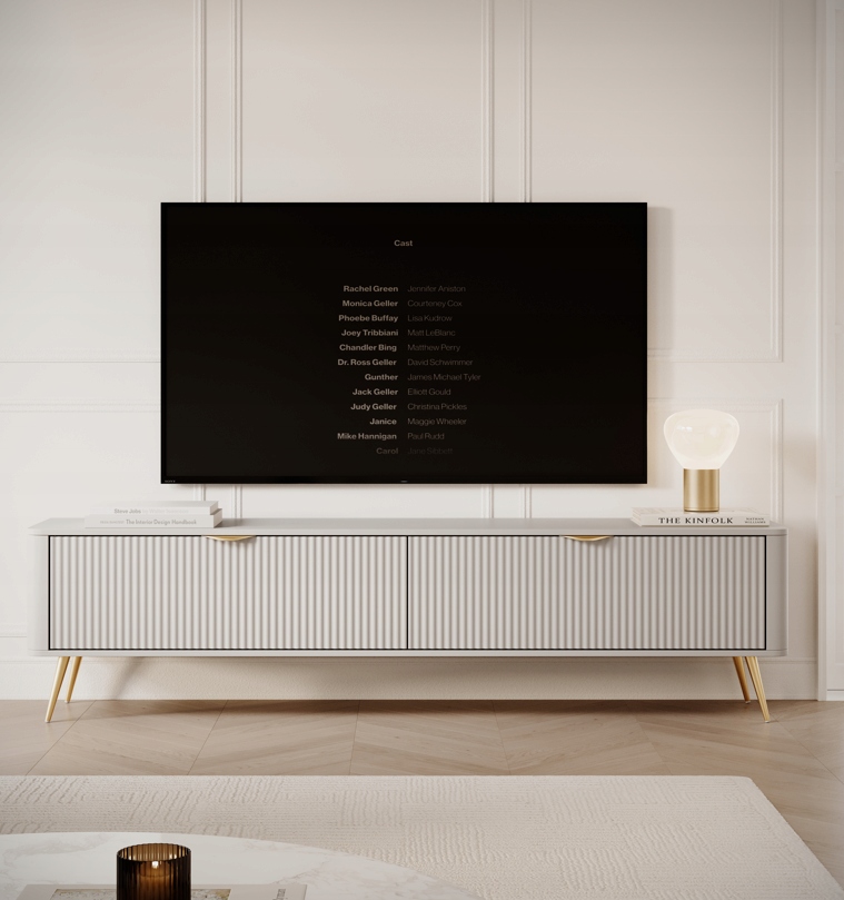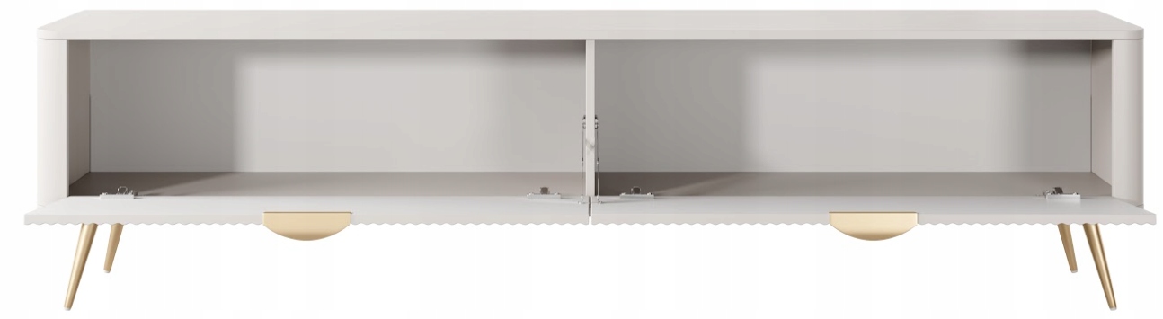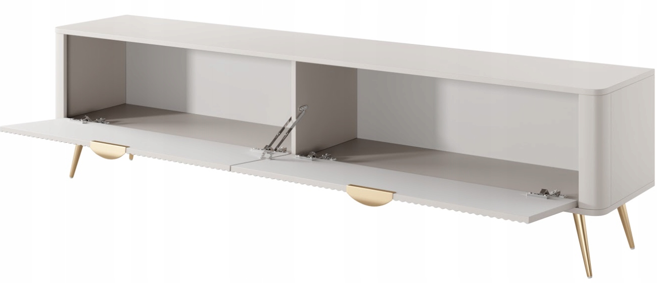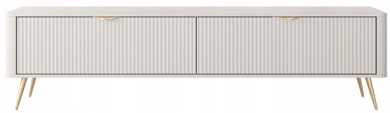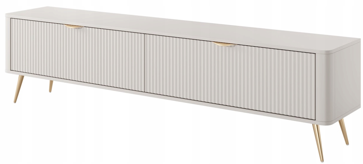Szafka RTV z kolekcji LANTE o długości aż dwóch metrów to imponująca propozycja dla osób, które szukają połączenia funkcjonalności i nowoczesnej elegancji. Beżowa kolorystyka nadaje wnętrzu spokoju i subtelnego uroku, a złote detale w postaci uchwytów i wysokich, walcowatych nóżek podkreślają styl glamour, który świetnie komponuje się z jasnymi i kobiecymi aranżacjami. Ryflowane fronty oraz zaoblone listwy boczne dodają bryle lekkości i przyciągają wzrok wyrazistą formą. Dzięki dużej powierzchni użytkowej mebel idealnie sprawdzi się jako baza pod większy telewizor i sprzęt audio, oferując za dwoma drzwiczkami praktyczną przestrzeń do przechowywania tego, co warto mieć pod ręką, ale schowane z widoku. Fronty wykonano z płyty MDF z frezowaniem, korpus z płyty laminowanej, a zaokrąglone boki z MDF. Obrzeża wykończone są trwałą okleiną ABS. Całość dopełniają metalowe uchwyty i stabilne, złote nogi, które zapewniają trwałość i efektowny wygląd. Mebel został zaprojektowany i wyprodukowany w Polsce, a jego montaż jest prosty i intuicyjny.