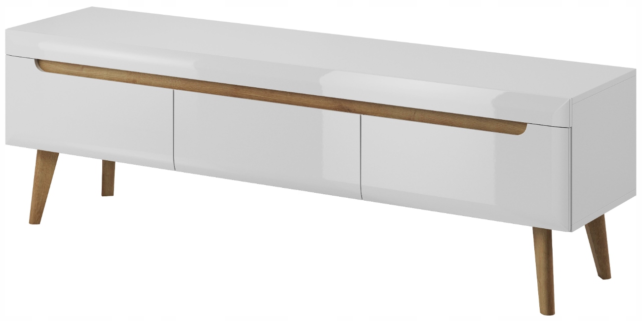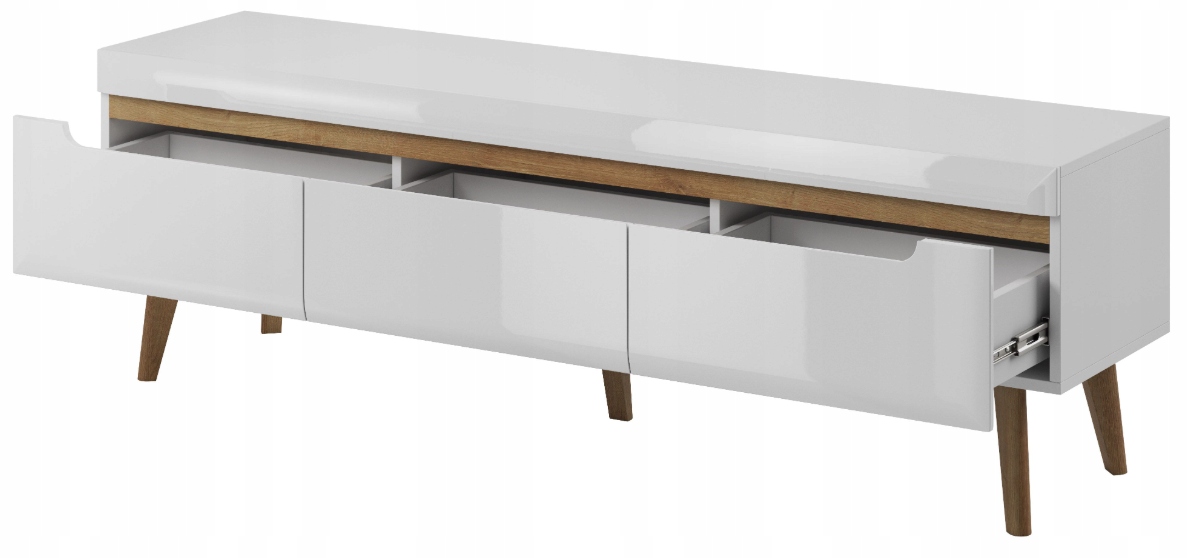 Kolekcja mebli NORDI to doskonały wybór dla osób ceniących nowoczesny design połączony z przytulnym klimatem. Białe, błyszczące fronty z płyty MDF przyciągają wzrok i pięknie odbijają światło, optycznie powiększając przestrzeń. Ciepłe wstawki w kolorze dąb Riviera dodają wnętrzu charakteru i naturalnej elegancji, tworząc harmonijną całość idealną do salonu, sypialni czy pokoju dziennego. Uwagę zwracają również wysokie, drewniane nóżki, które nadają bryłom lekkości, a przy tym ułatwiają utrzymanie porządku pod meblami – idealne rozwiązanie dla użytkowników robotów sprzątających!